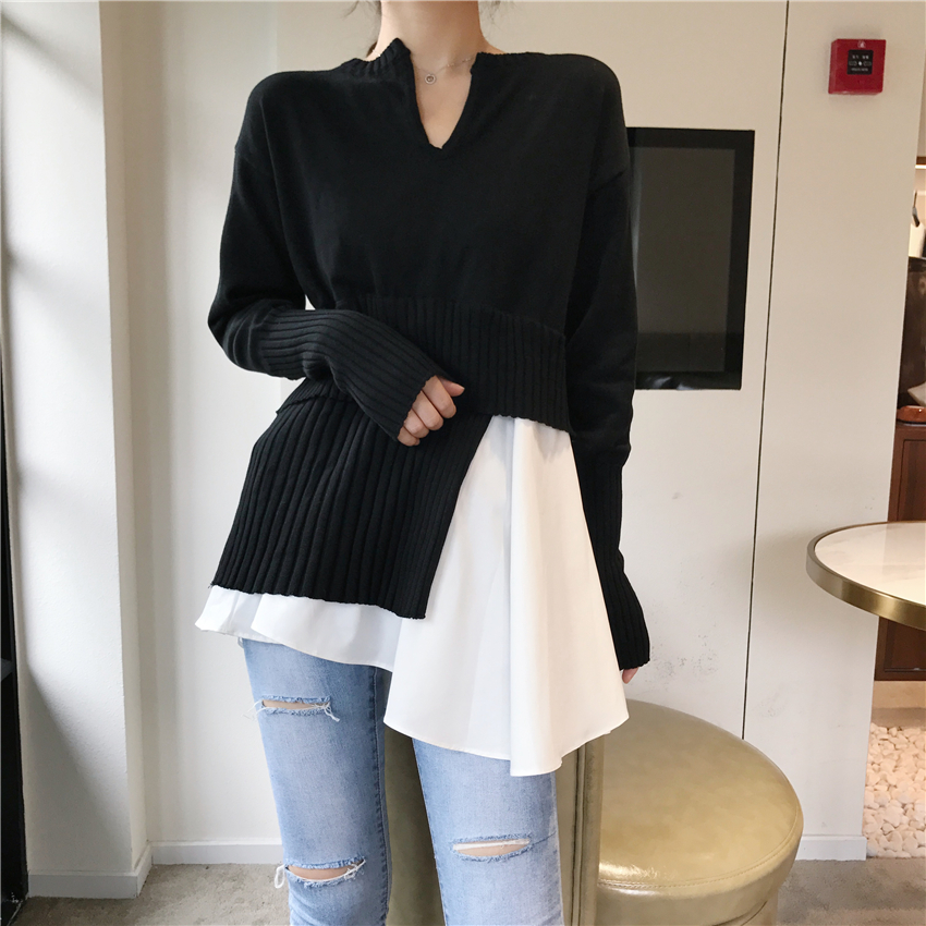 / 時尚網紅同款2018新款秋冬寬松慵懶風套頭毛衣女拼接不規則針織衫