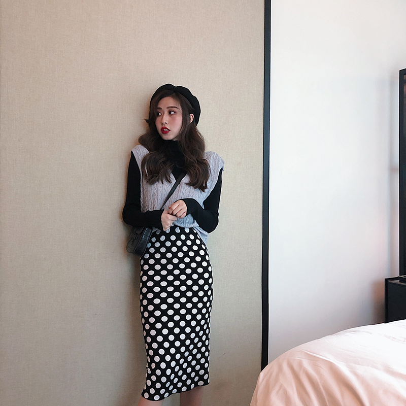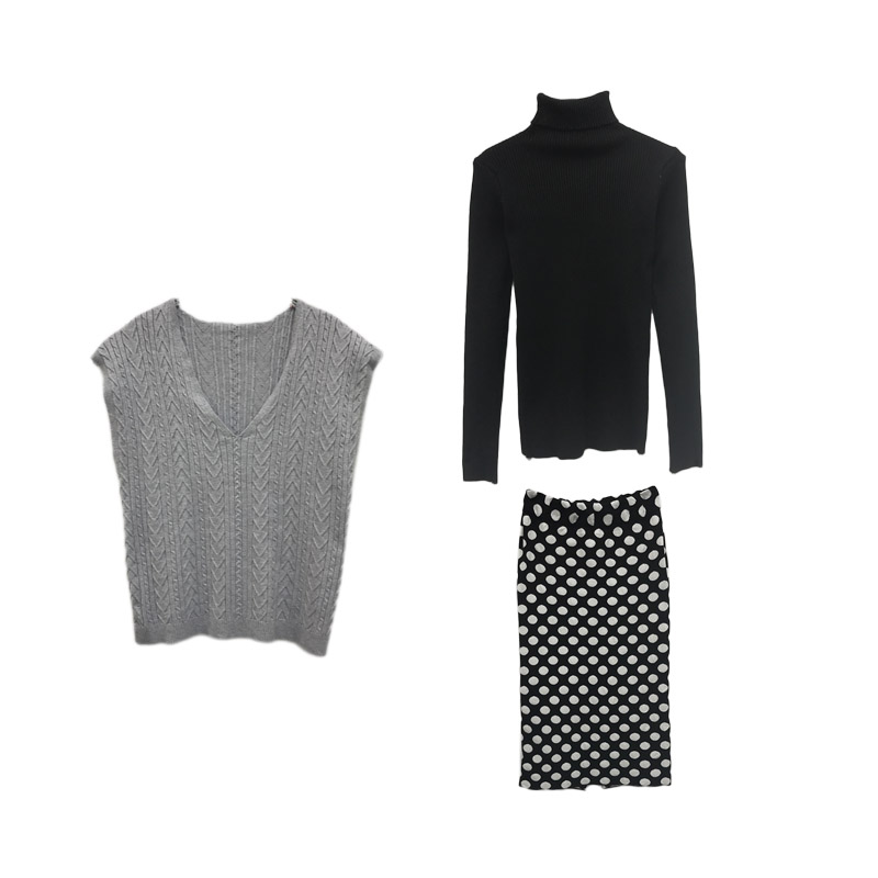 / 包芯紗V領無袖毛衣背心+高領打底針織衫+波點半身裙時尚三件套裝