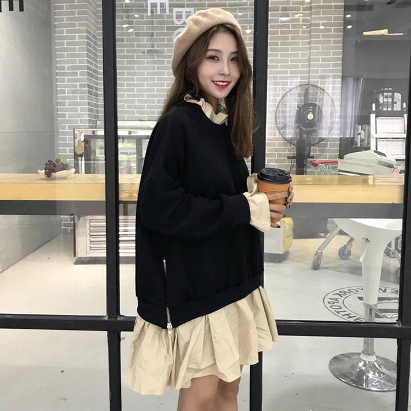 2018秋裝女新款韓版寬松假兩件側拉鏈長袖拼接中長款木耳邊衛衣裙