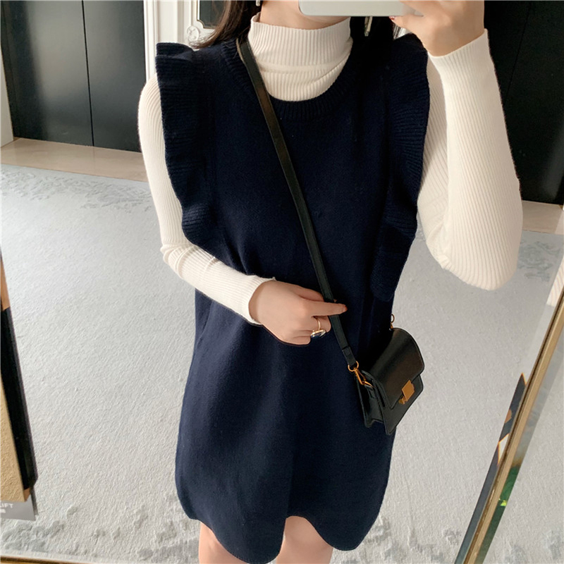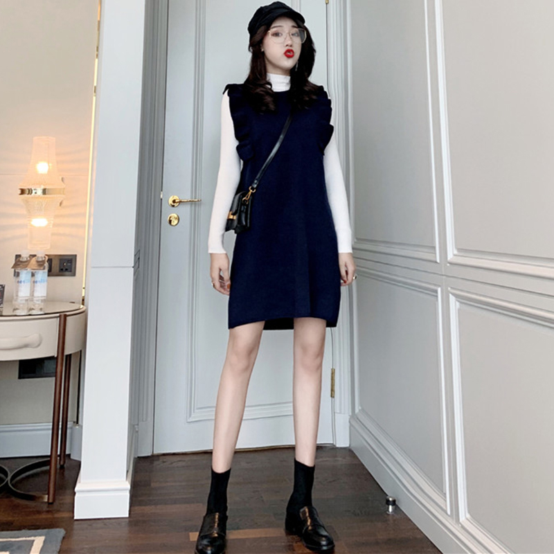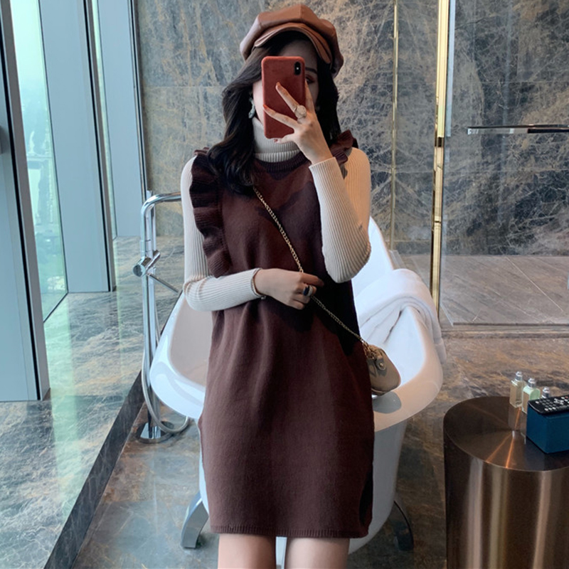 氣質女神兩件套秋冬裝新款中長款荷葉邊背心裙修身高領打底針織衫