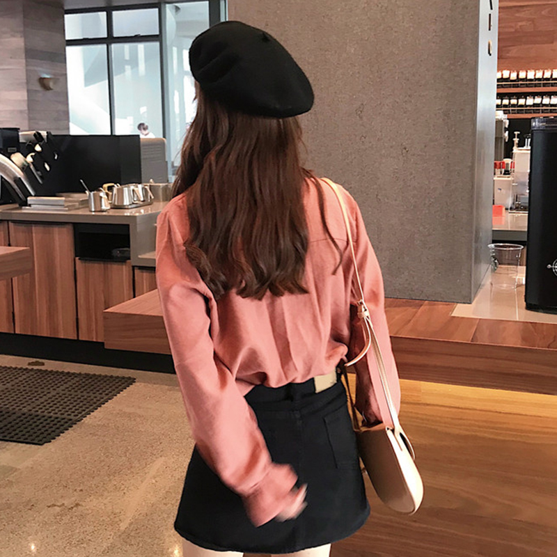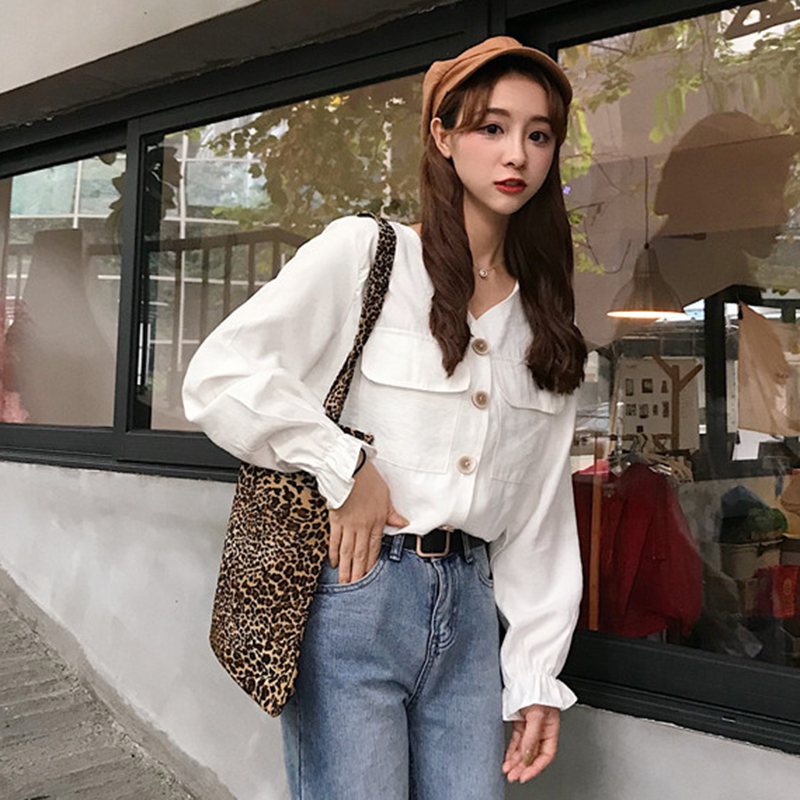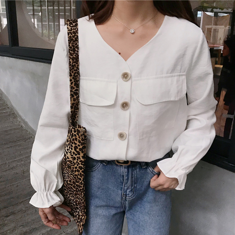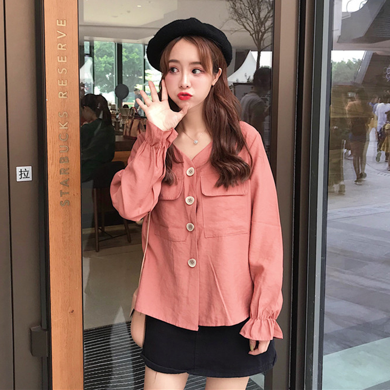 寬松荷葉長袖襯衫秋裝女2018新款復古風V領襯衣學生休閑白色上衣