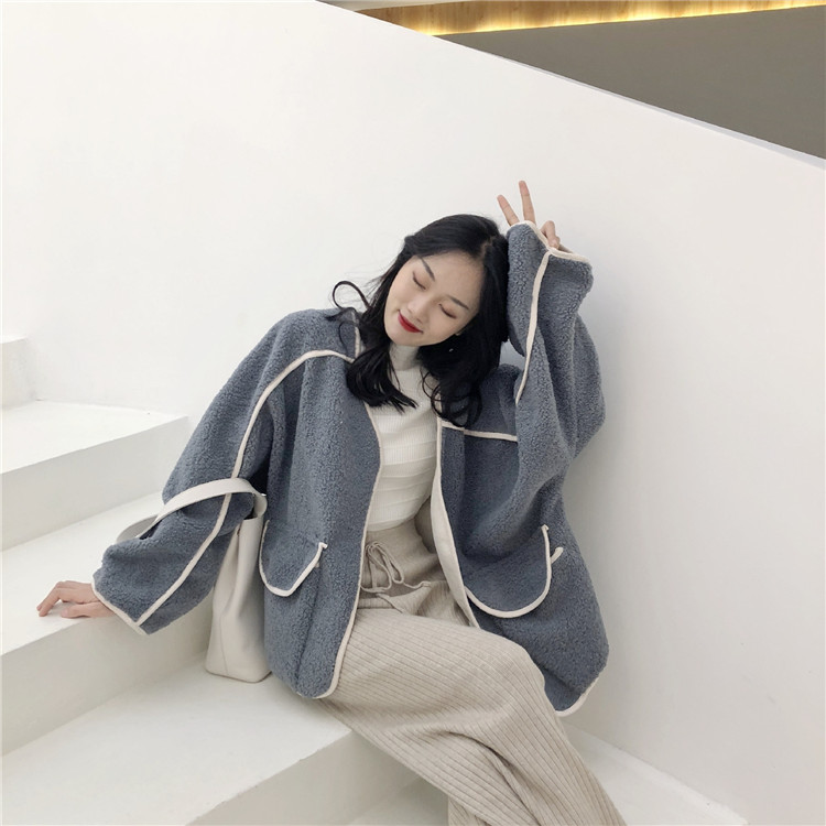 / 港味冬季加厚撞色條邊羊羔毛拼鹿皮絨百搭寬松保暖長袖外套女新款