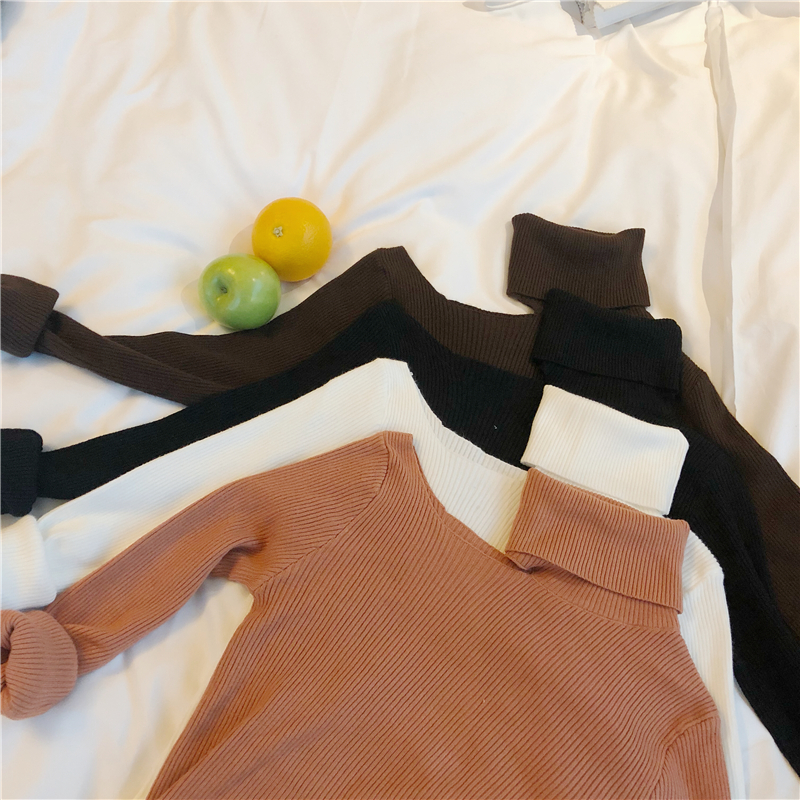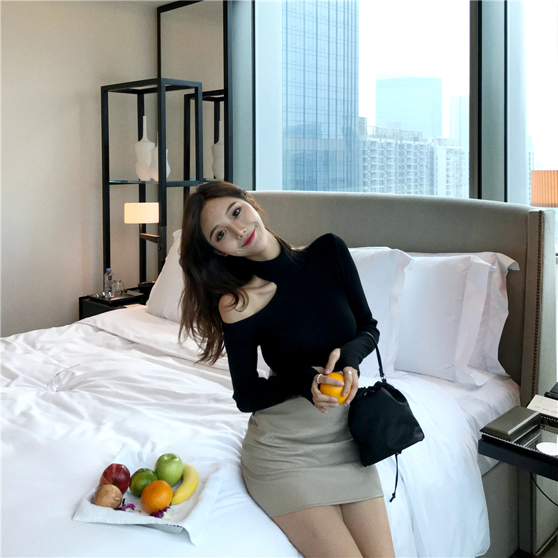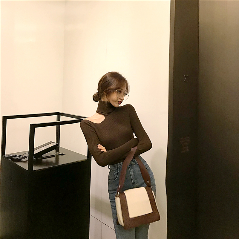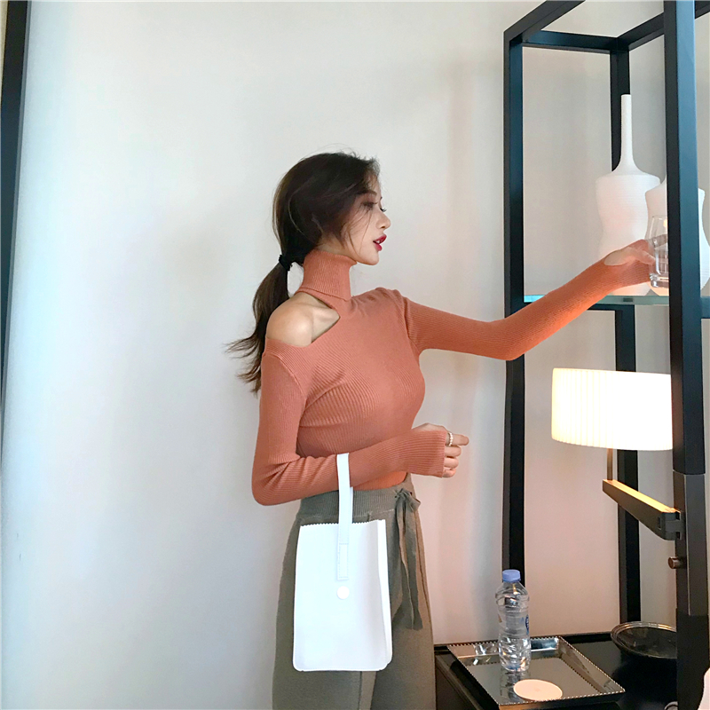 chic早秋針織衫復古修身顯瘦高領小心機氣質單肩露肩針織打底上衣