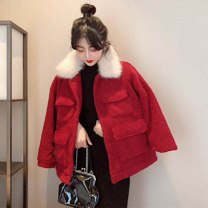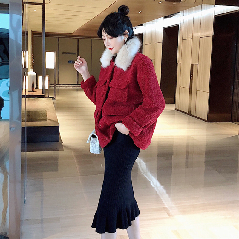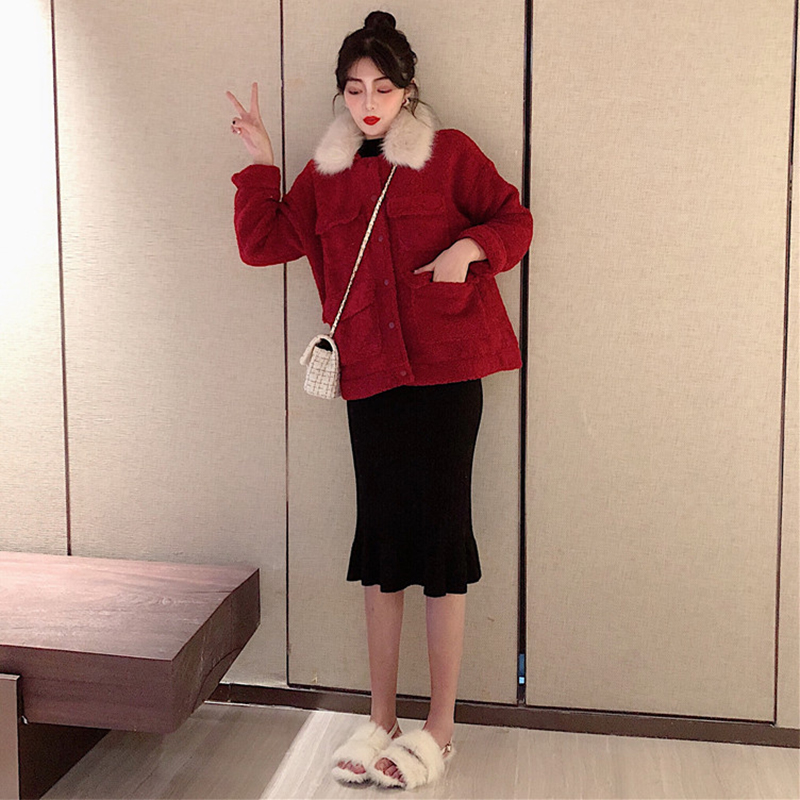 時尚套裝女2018秋冬新款大毛領羊羔毛外套中長款修身顯瘦打底裙子