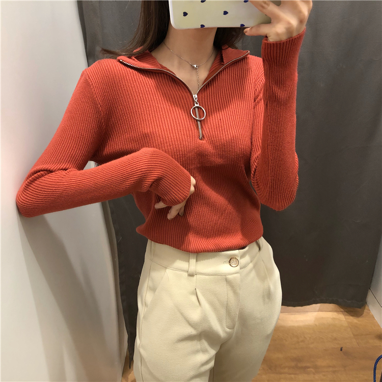 韓版chic早秋毛衣慵懶風氣質半高領圓環拉鏈修身長袖打底針織衫潮