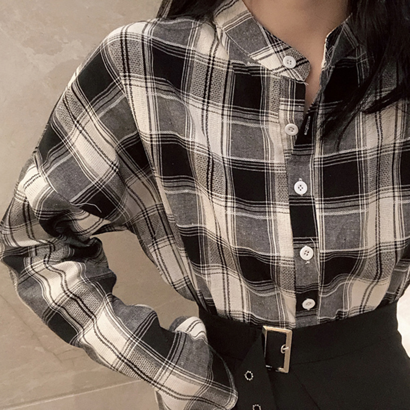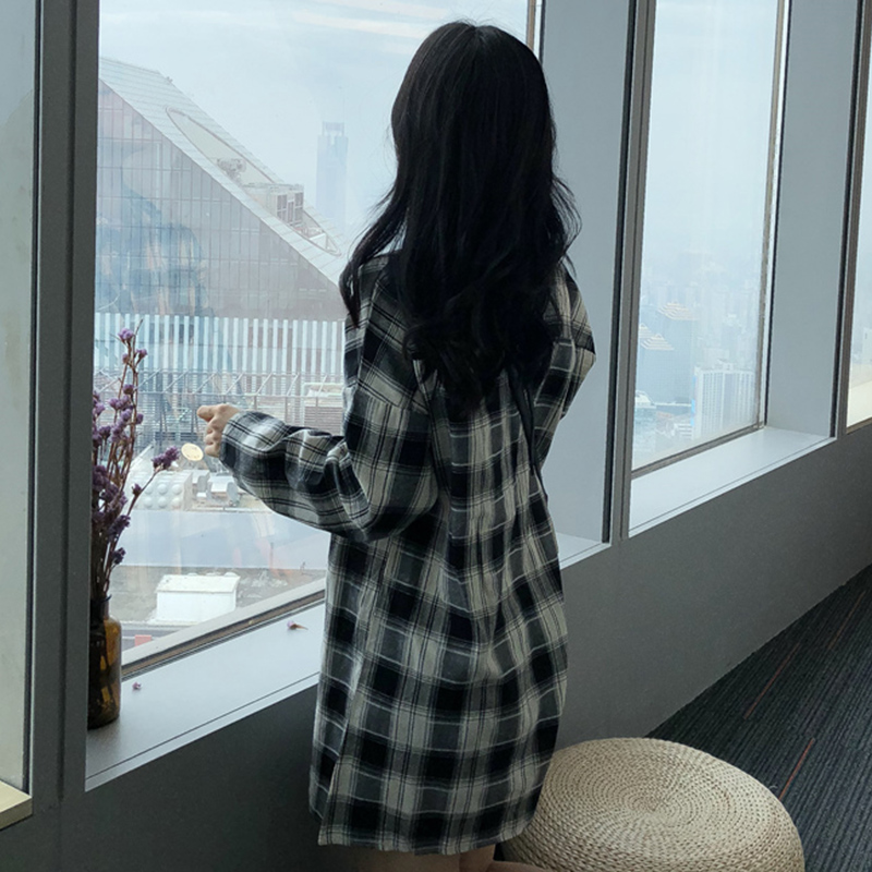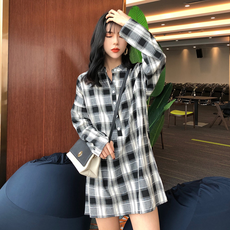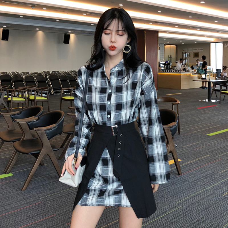 / 韓版兩件套裝女寬松收腰中長格子襯衫連衣裙秋裝新款個性高腰短裙