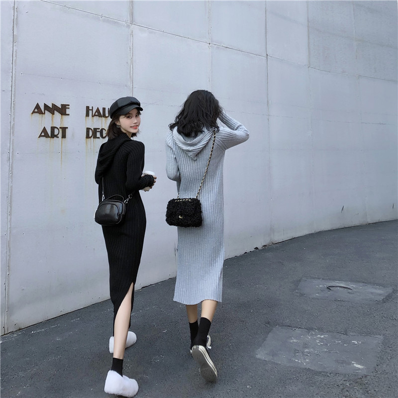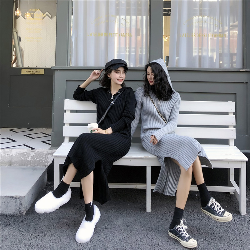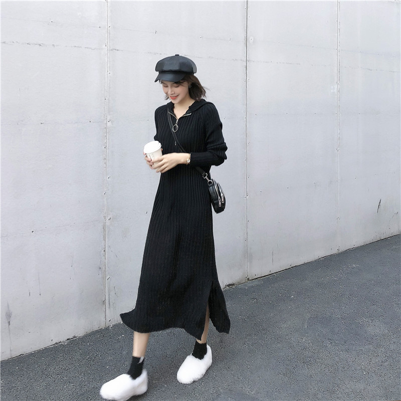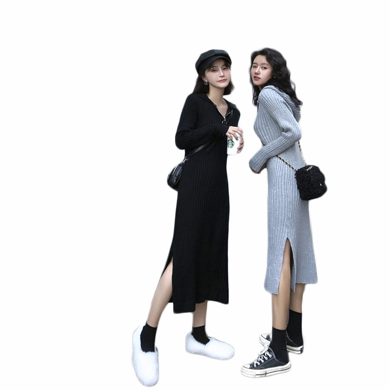 港味裙子女秋冬2018新款連帽中長款過膝毛衣裙長袖針織連衣裙女潮