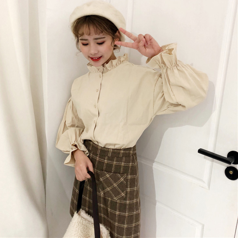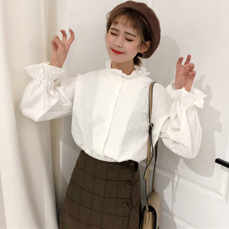 / 少女泡泡長袖白襯衫早秋新款女裝甜美百搭學生寬松荷葉領打底上衣