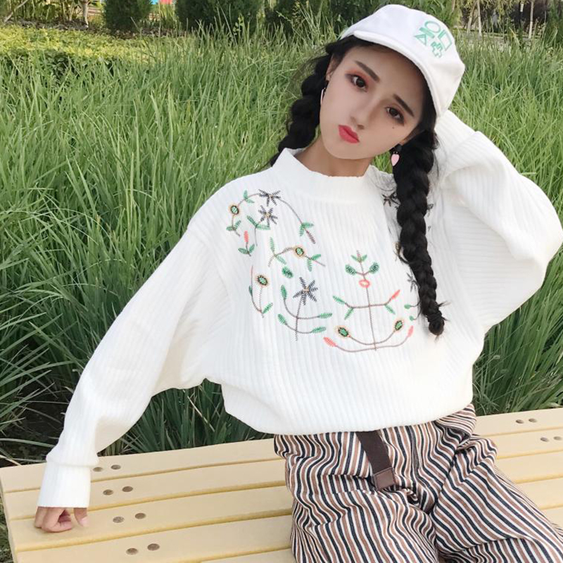 學生百搭套頭衛衣女2018秋裝新款韓版繡花寬松蝙蝠衫休閑長袖上衣