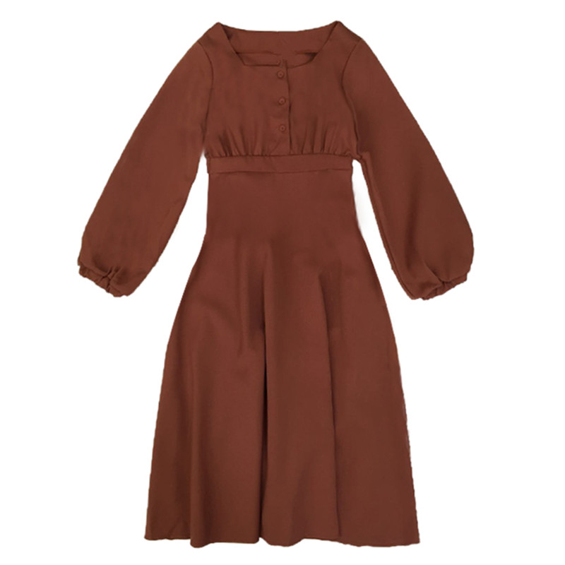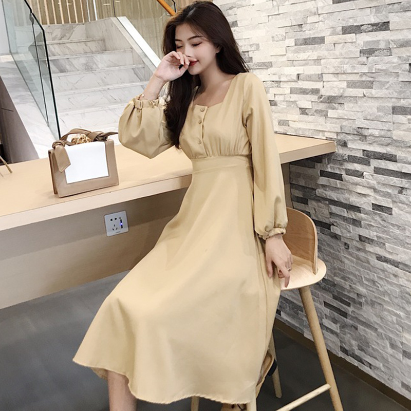 大擺裙子早秋新款女裝復古中長款收腰方領連衣裙氣質燈籠袖小黑裙