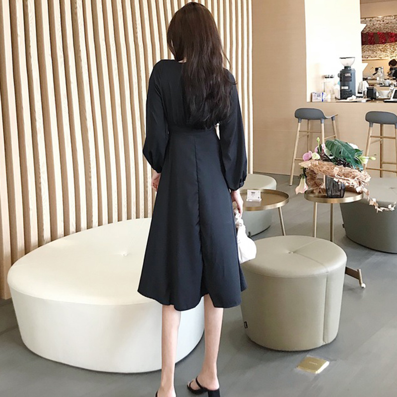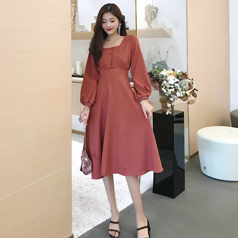/ 大擺裙子早秋新款女裝復古中長款收腰方領連衣裙氣質燈籠袖小黑裙