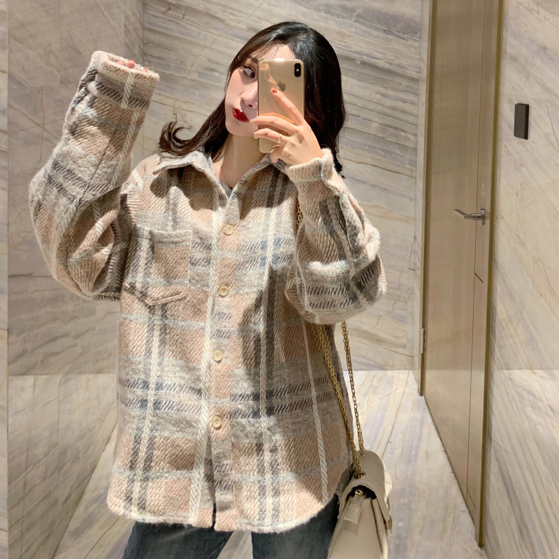 / 寬松粉色格子紋中長款長袖羊毛呢子大衣毛呢外套女秋冬2018新款潮