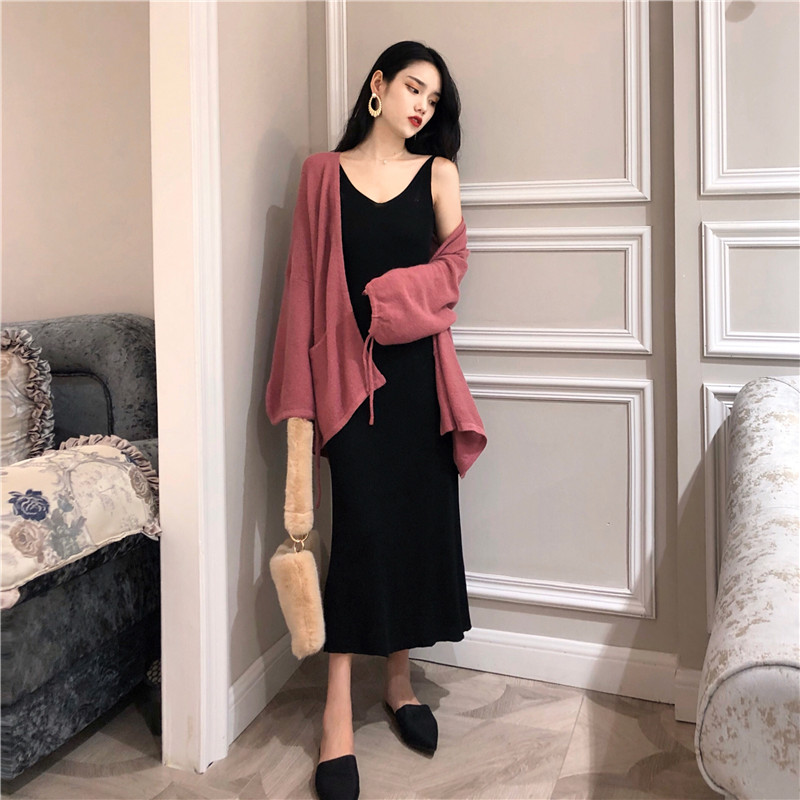秋裝女2018新款套裝V領針織吊帶連衣裙+慵懶純色毛衣針織開衫外套