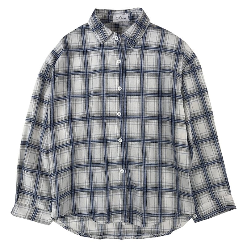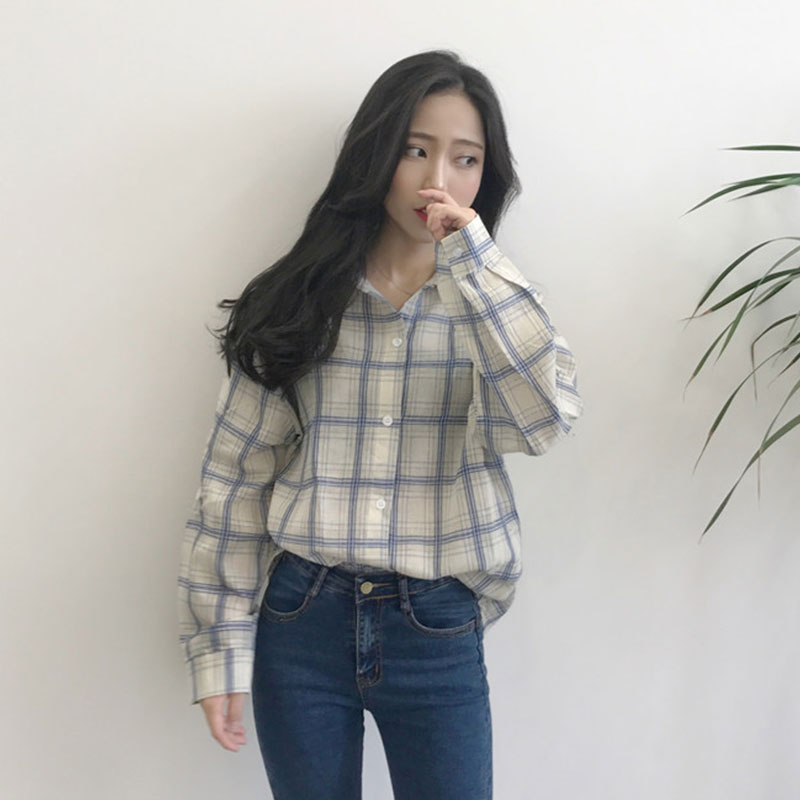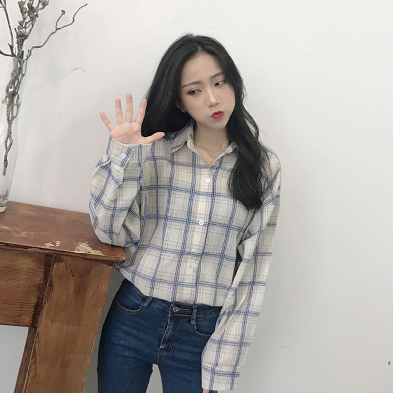 / 春季女裝新款韓版寬松單排扣復古格子防曬襯衫女學生休閑襯衣開衫