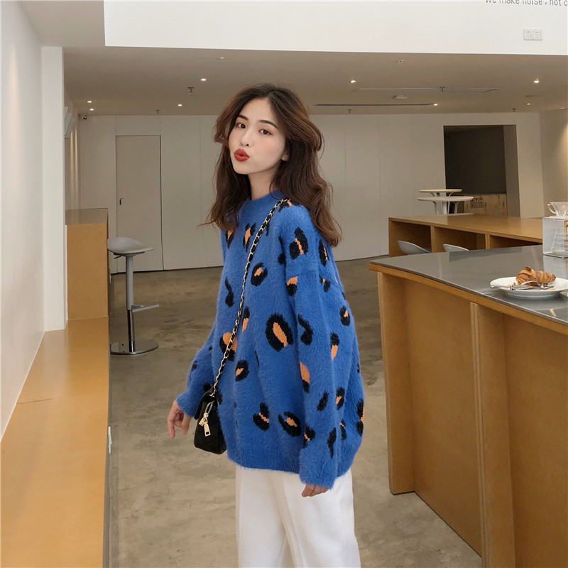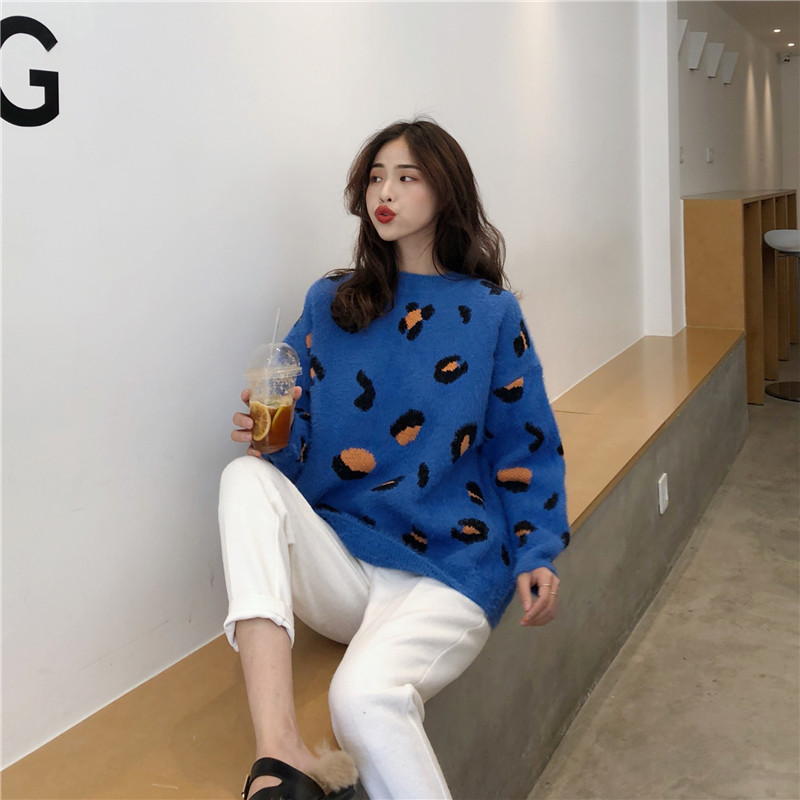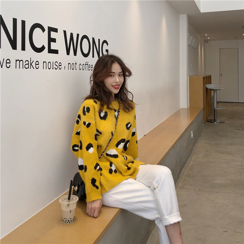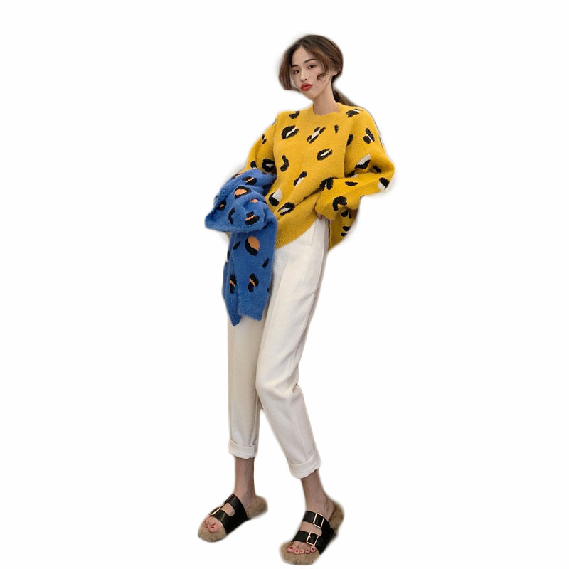 時尚圓領豹寬松慵懶風紋毛毛斑點針織衫+高腰直筒蘿卜毛呢褲套裝