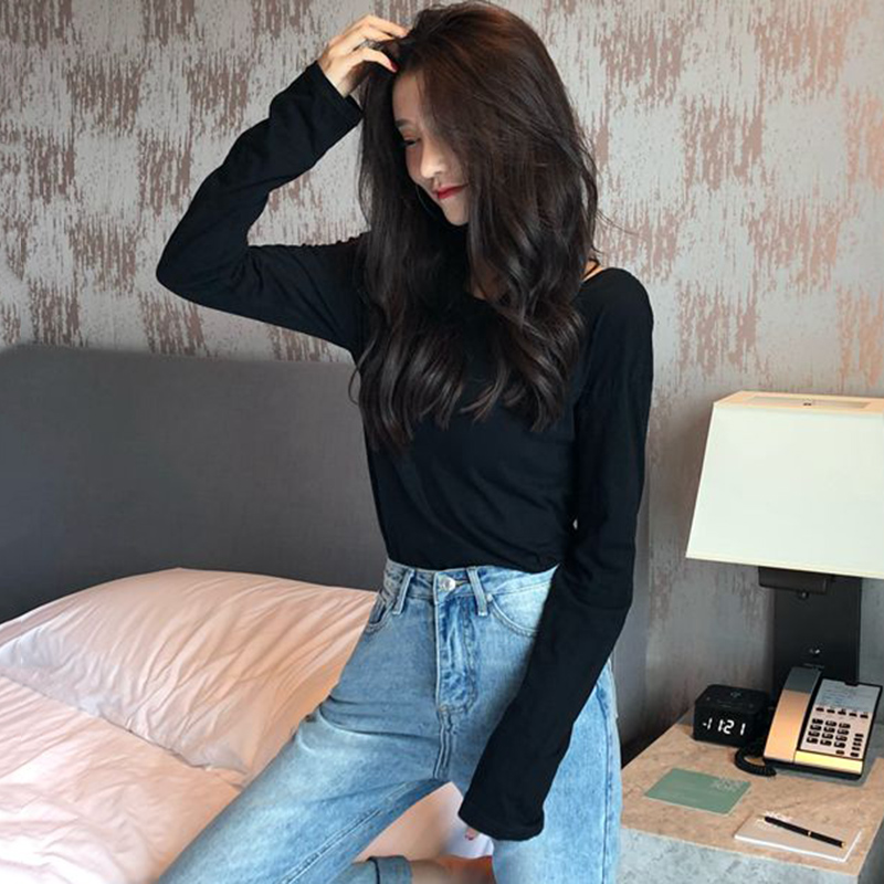 / 心機露背修身長袖打底衫女早秋新款韓版女裝學生黑色圓領T恤上衣