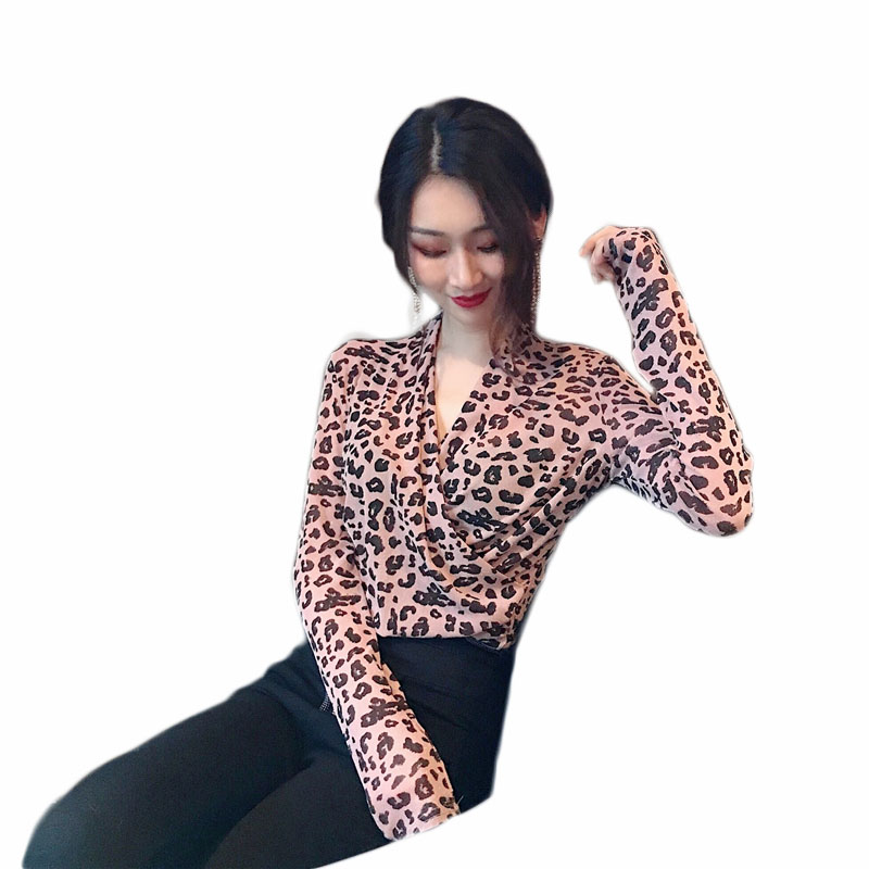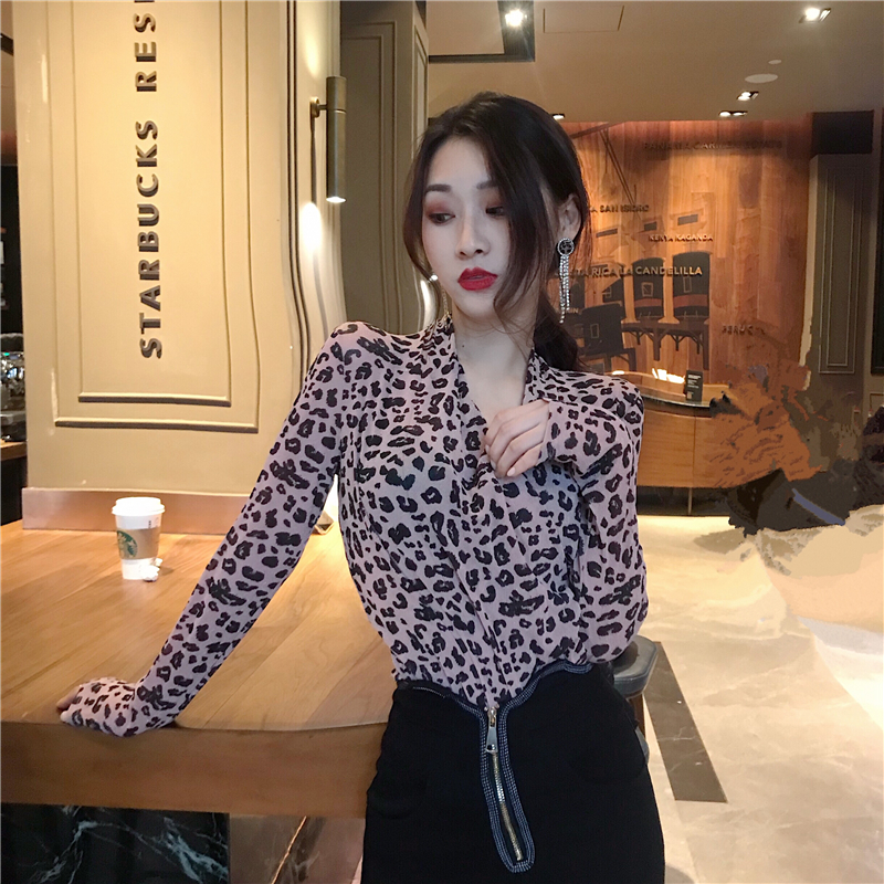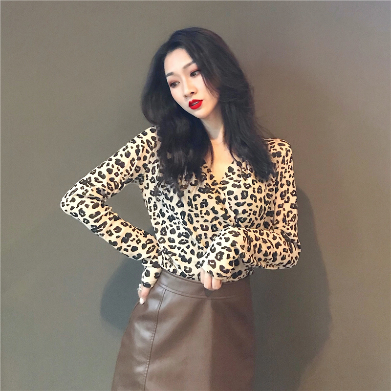 / 韓版網紅款時尚俏皮豹紋網紗蕾絲修身顯瘦打底長袖交叉領T恤女潮