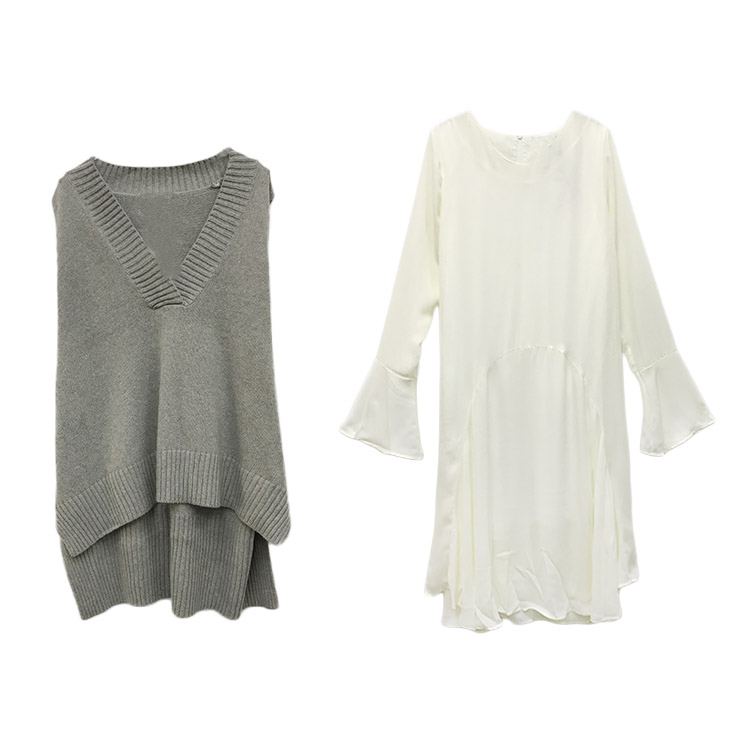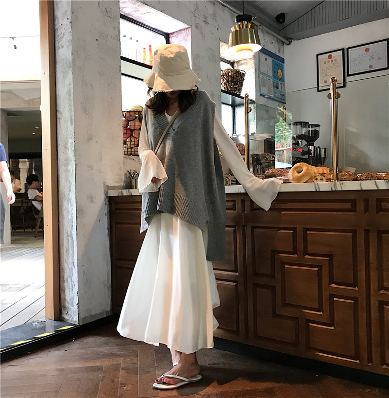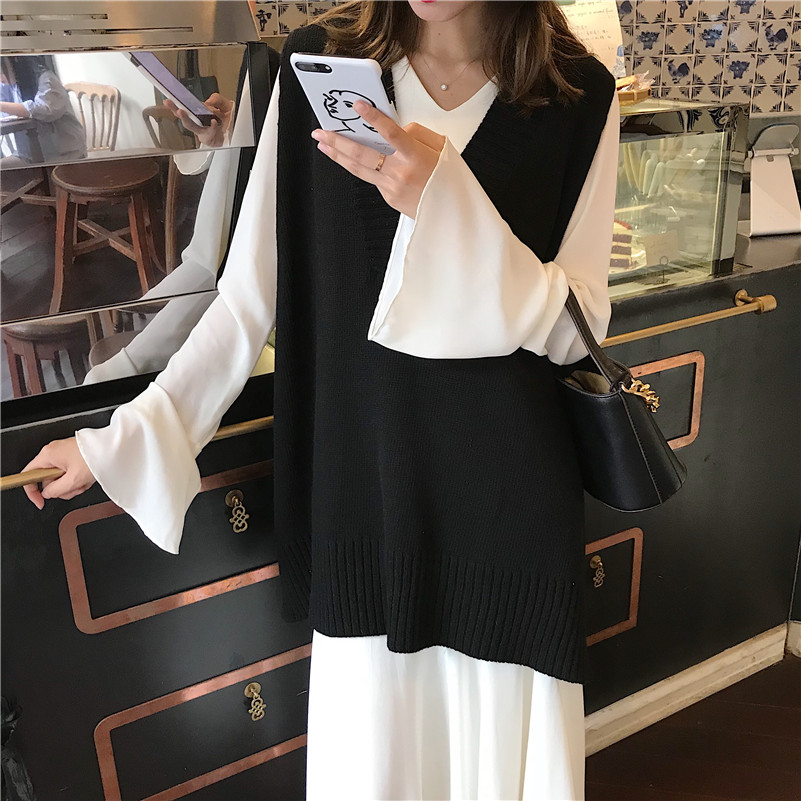 女神套裝秋復古寬松v領毛衣背心馬甲+初戀裙雪紡長袖連衣裙兩件套
