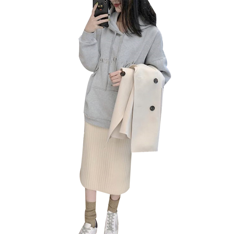 女神套裝秋冬新款2018流行毛呢外套加絨連帽衛衣高腰針織半身裙子