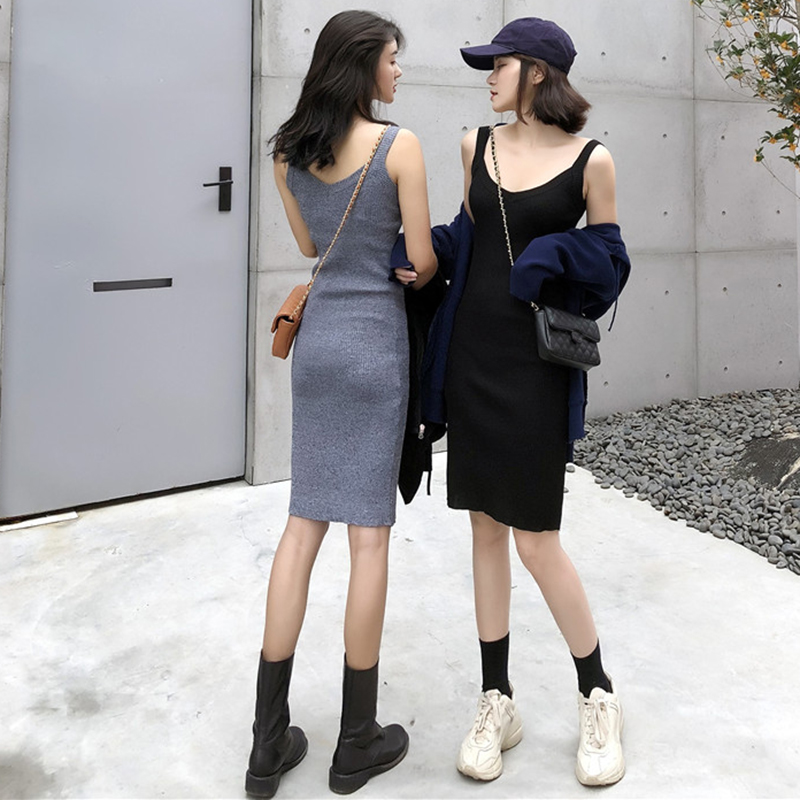 氣質中長款V領針織打底裙女秋冬裝2018新款韓版修身顯瘦連衣裙子