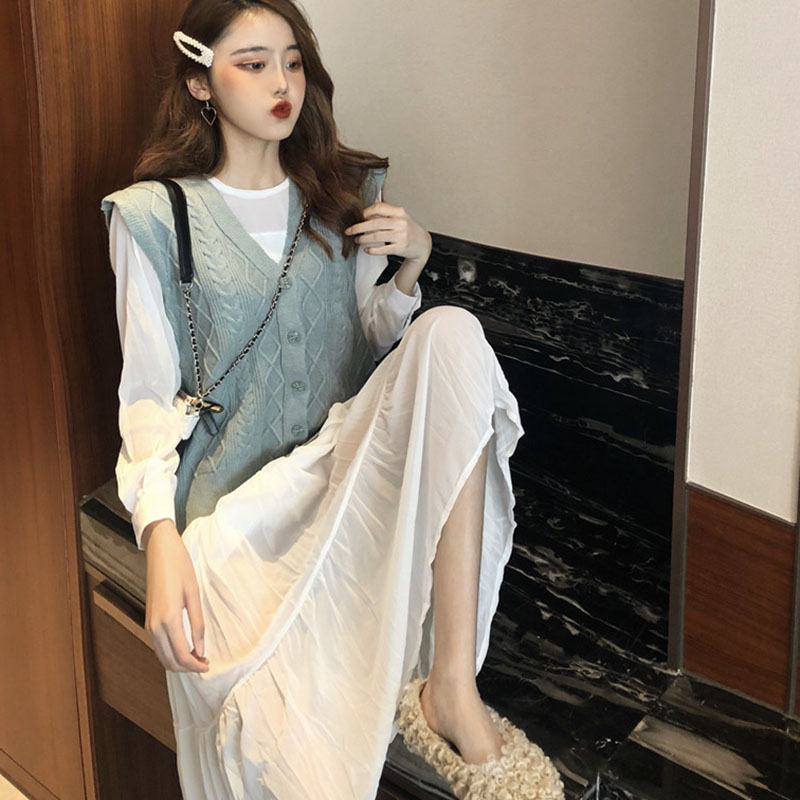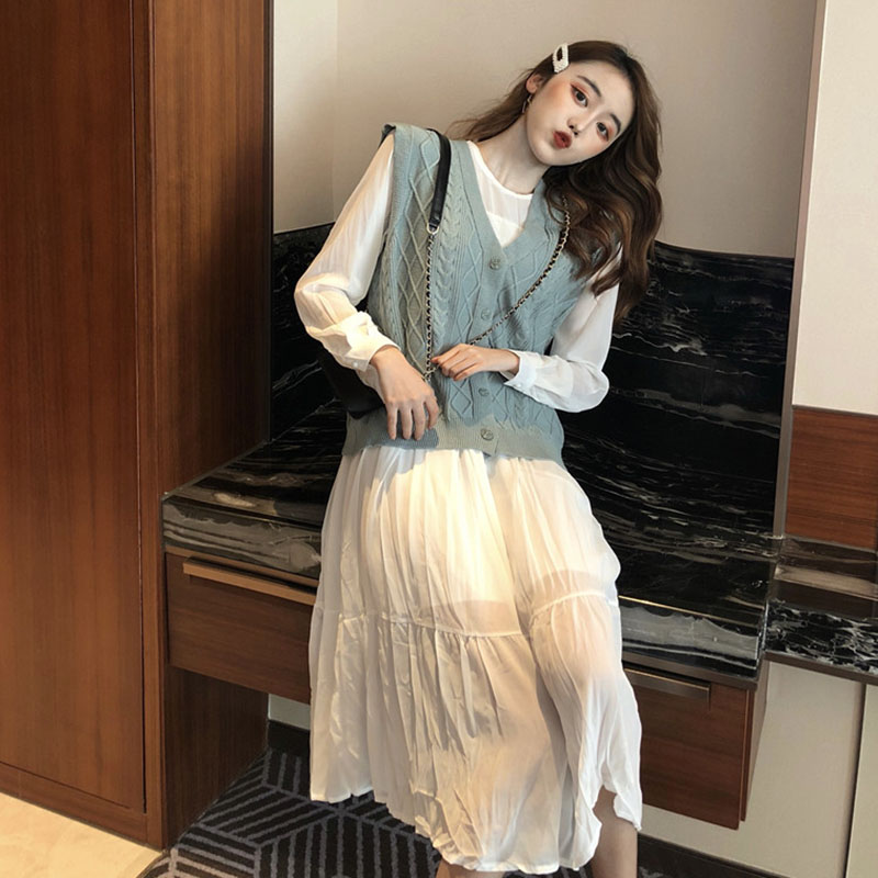 女神套裝秋復古寬松v領毛衣背心馬甲+初戀裙雪紡長袖連衣裙兩件套