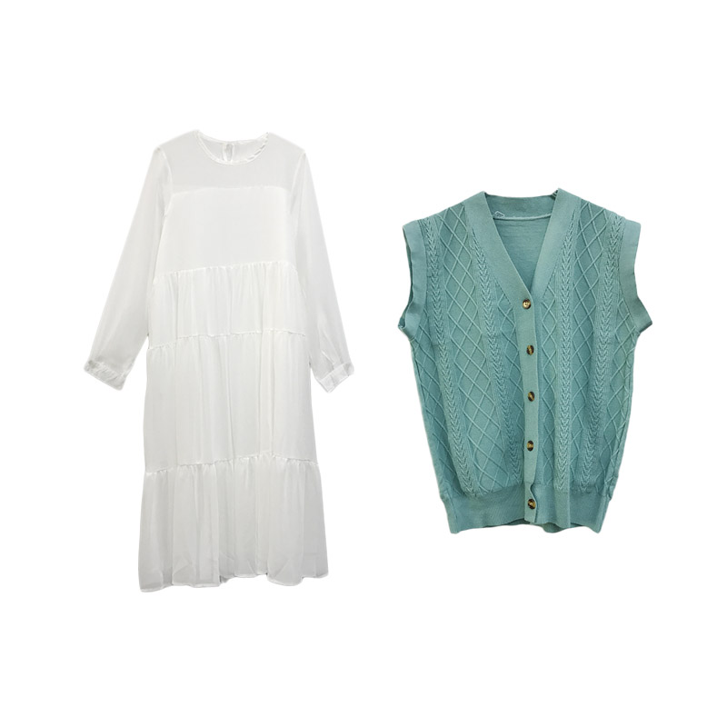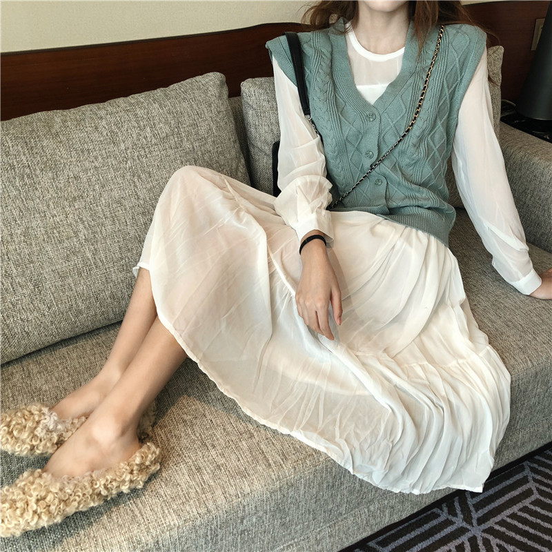 / 女神套裝秋復古寬松v領毛衣背心馬甲+初戀裙雪紡長袖連衣裙兩件套