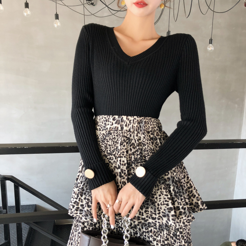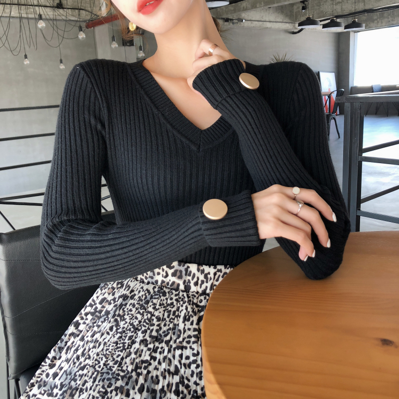 初秋溫柔風毛衣純色修身V領袖口紐扣針織衫套頭加厚長袖女上衣潮