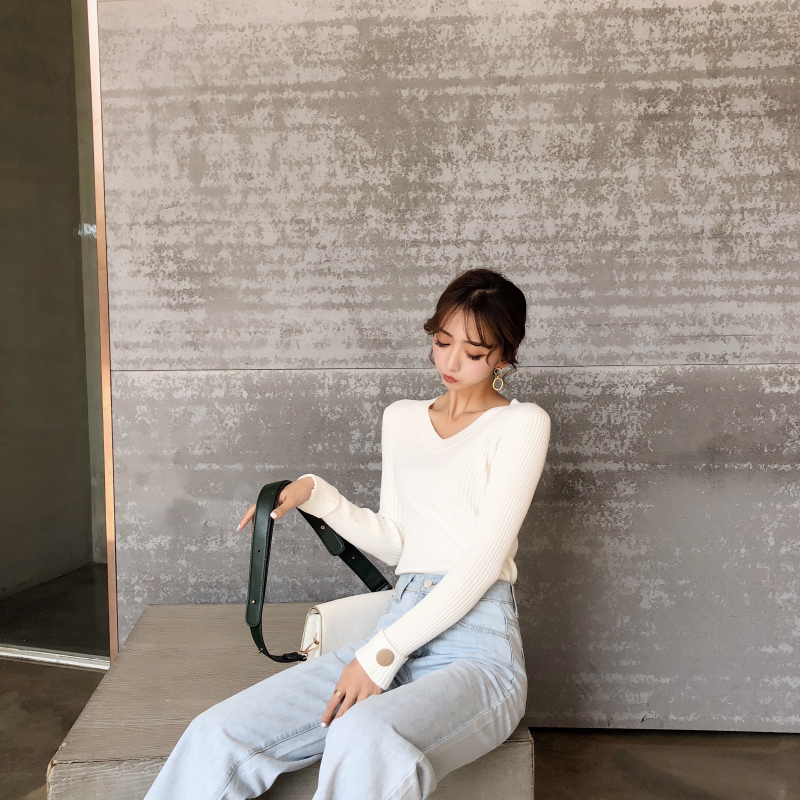 / 初秋溫柔風毛衣純色修身V領袖口紐扣針織衫套頭加厚長袖女上衣潮