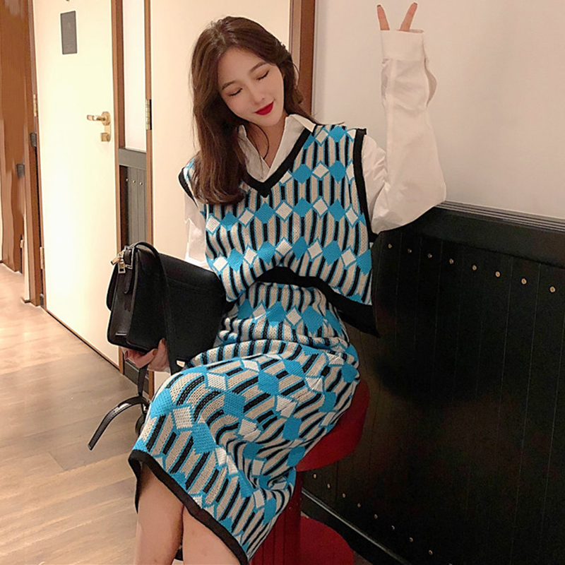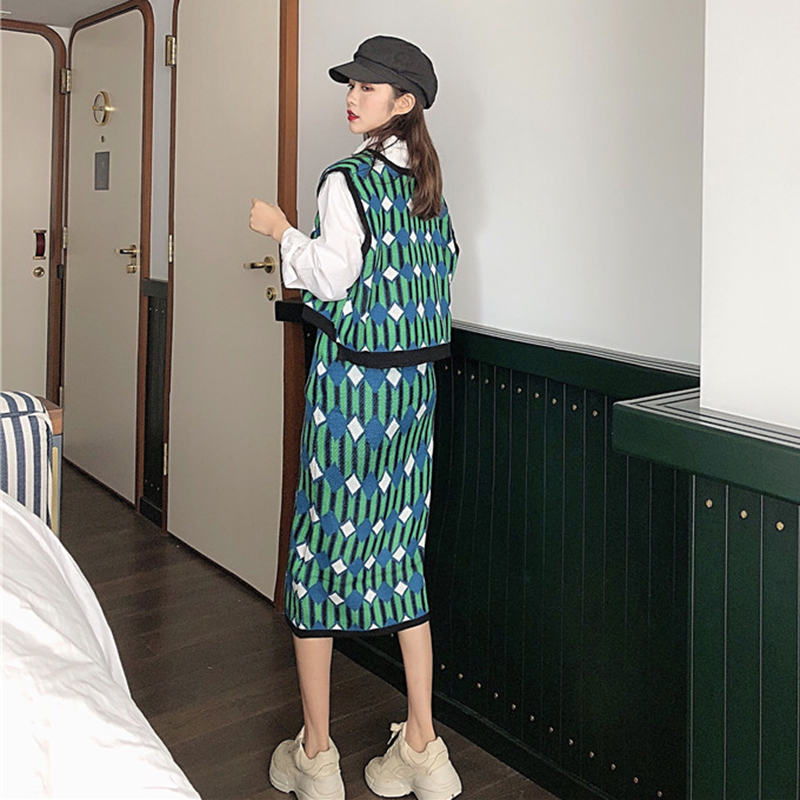 早秋時尚兩件套女裝2018新款復古幾何無袖針織衫氣質高腰半身裙子