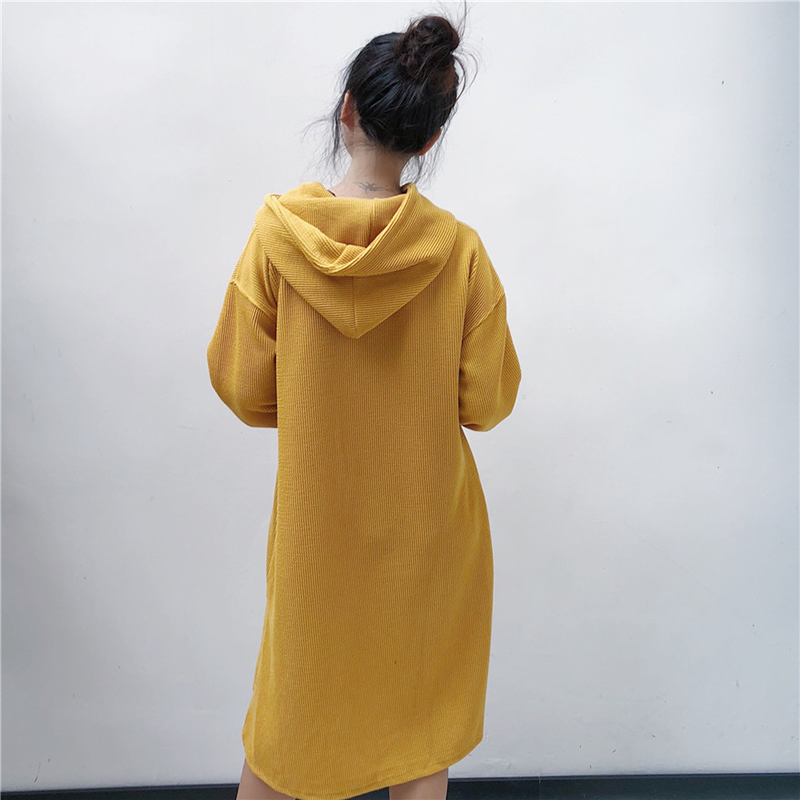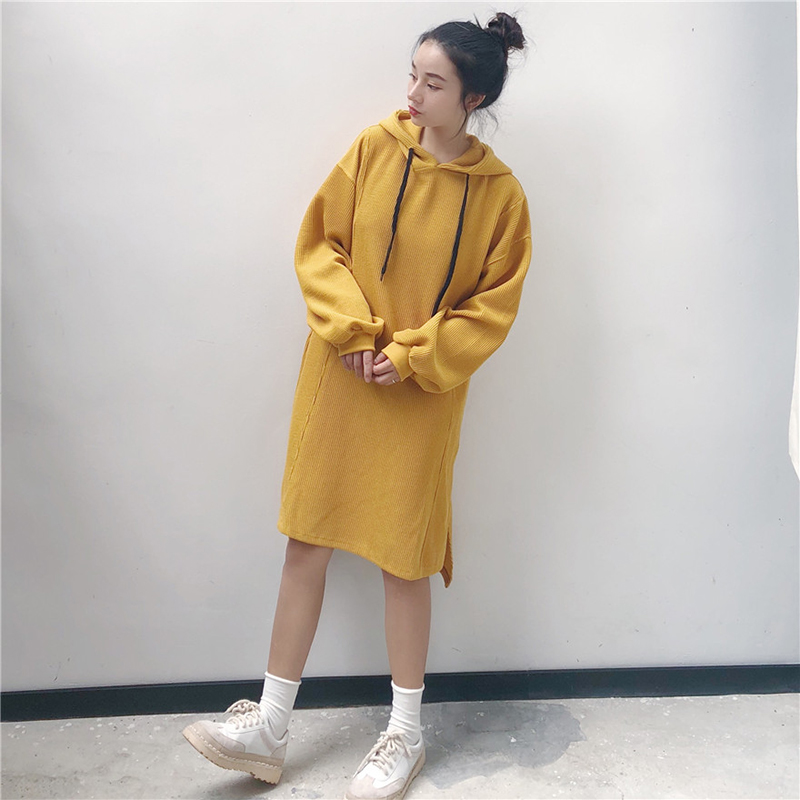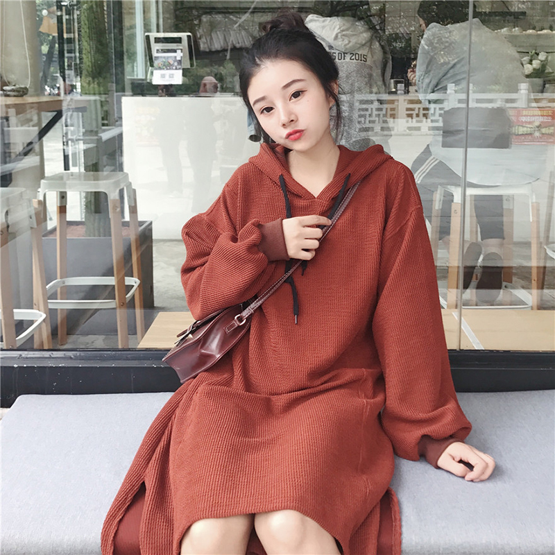 學院風連衣裙女秋裝新款寬松燈籠袖連帽衛衣學生休閑開叉中長裙子