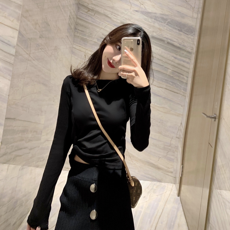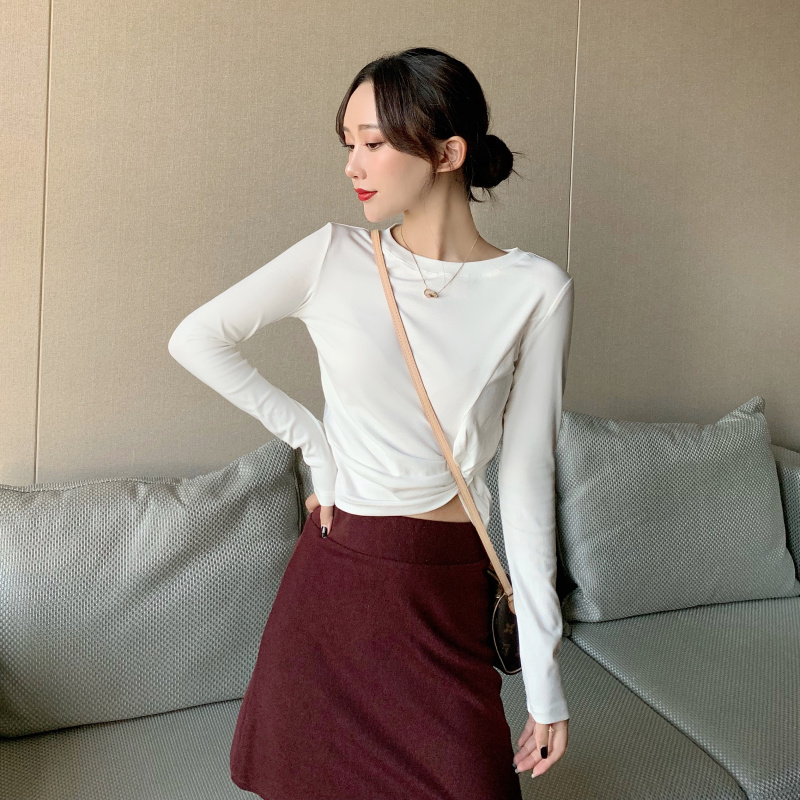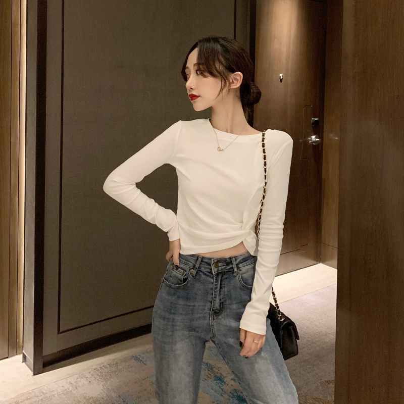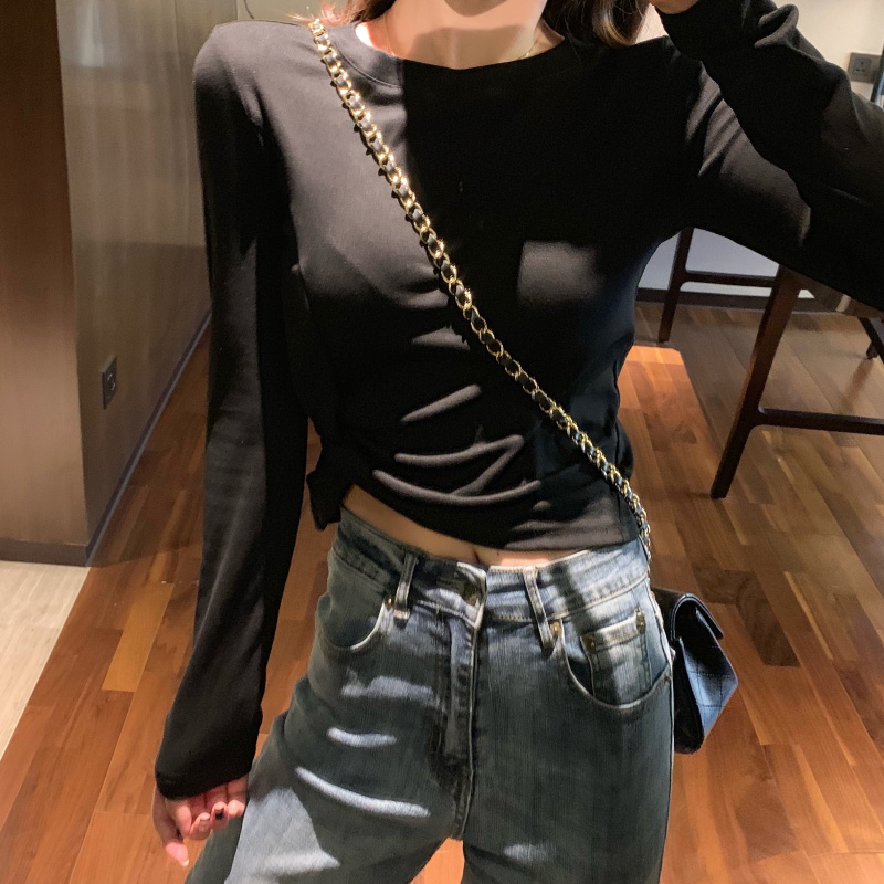 港味早秋上衣女慵懶長袖t袖女寬松顯瘦純色打結韓版短款打底衫女
