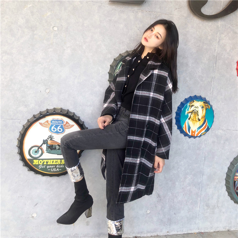 毛呢外套女冬季大衣女新款2018韓國復古風修身顯瘦中長款格子上衣