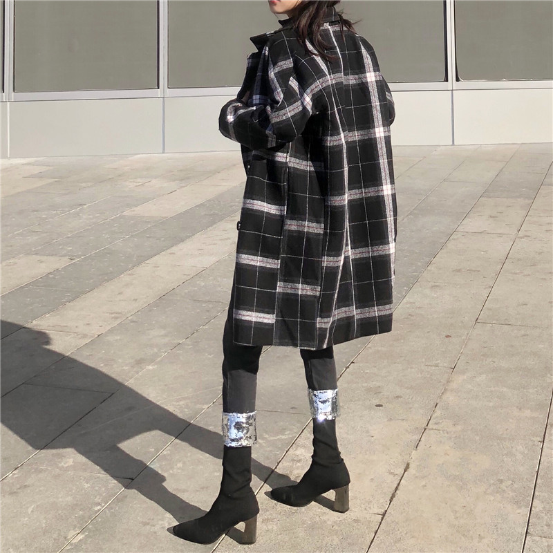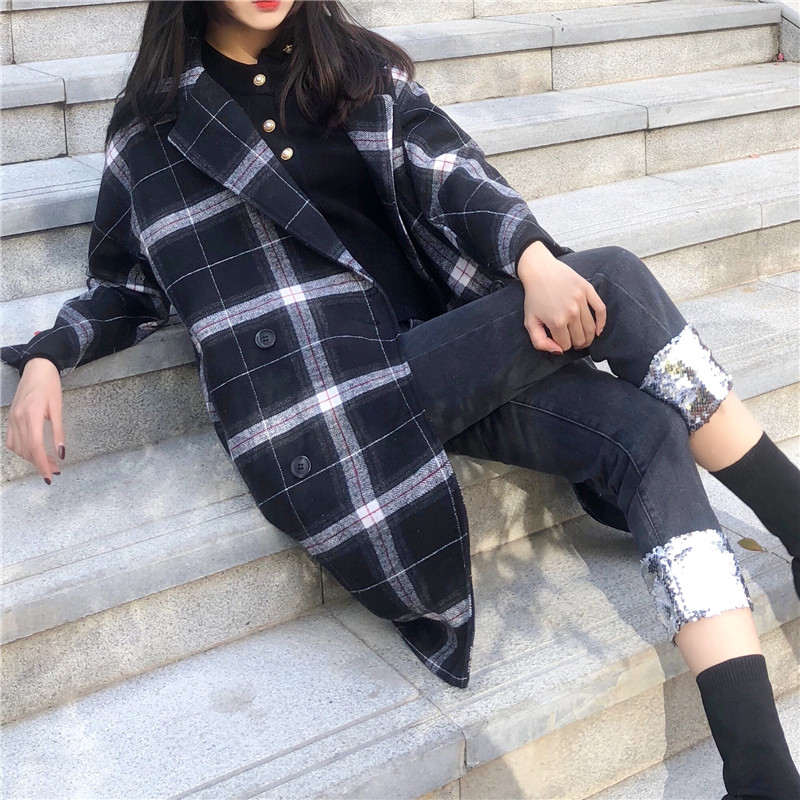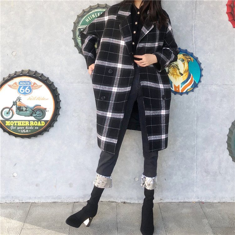 復古格子外套女秋裝2018新款ulzzang雙排扣寬松長款過膝呢子大衣