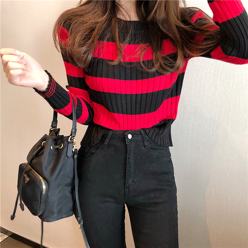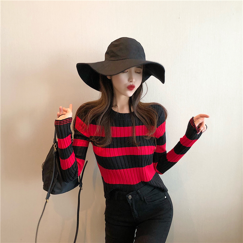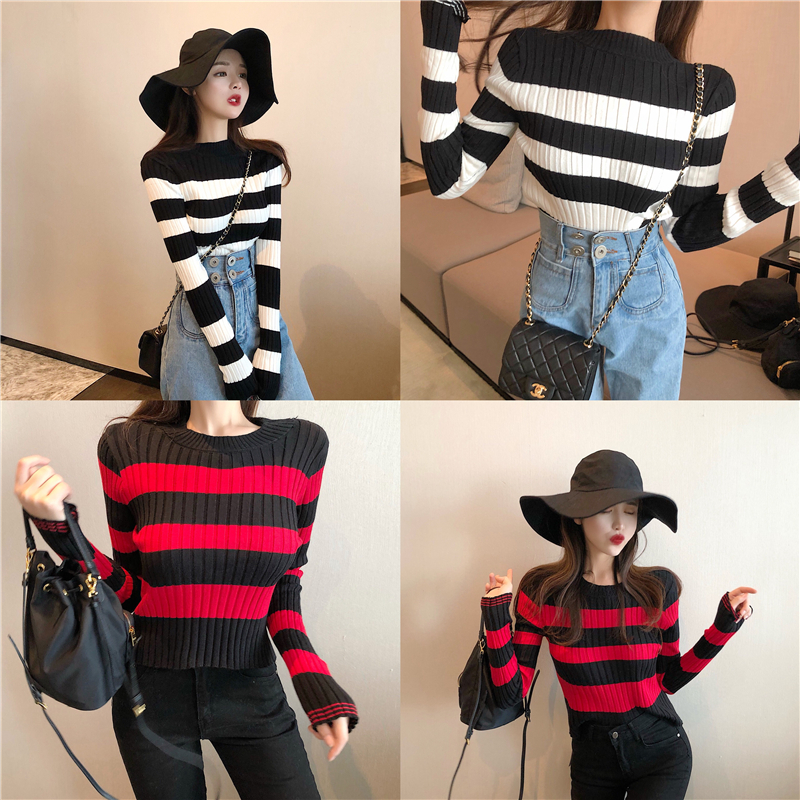 時尚秋裝女2018新款氣質百搭韓版拼色彩條圓領顯瘦針織衫打底衫潮