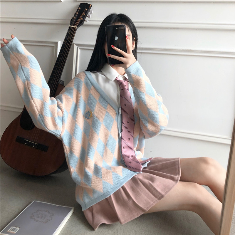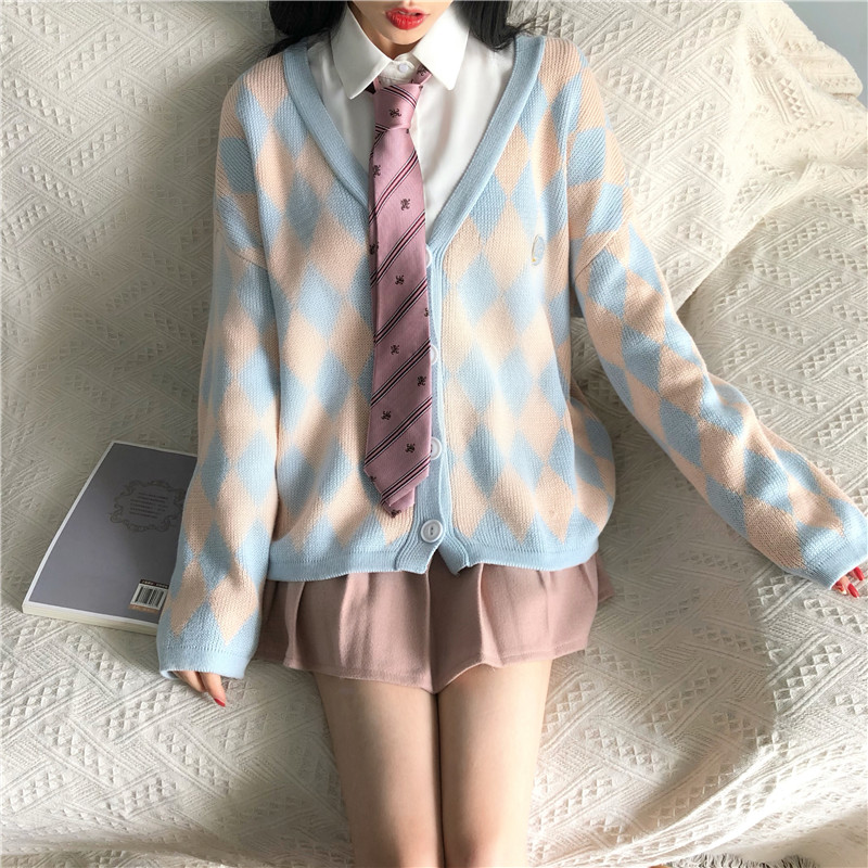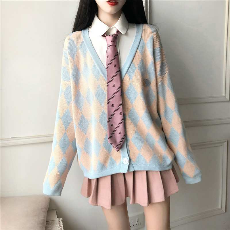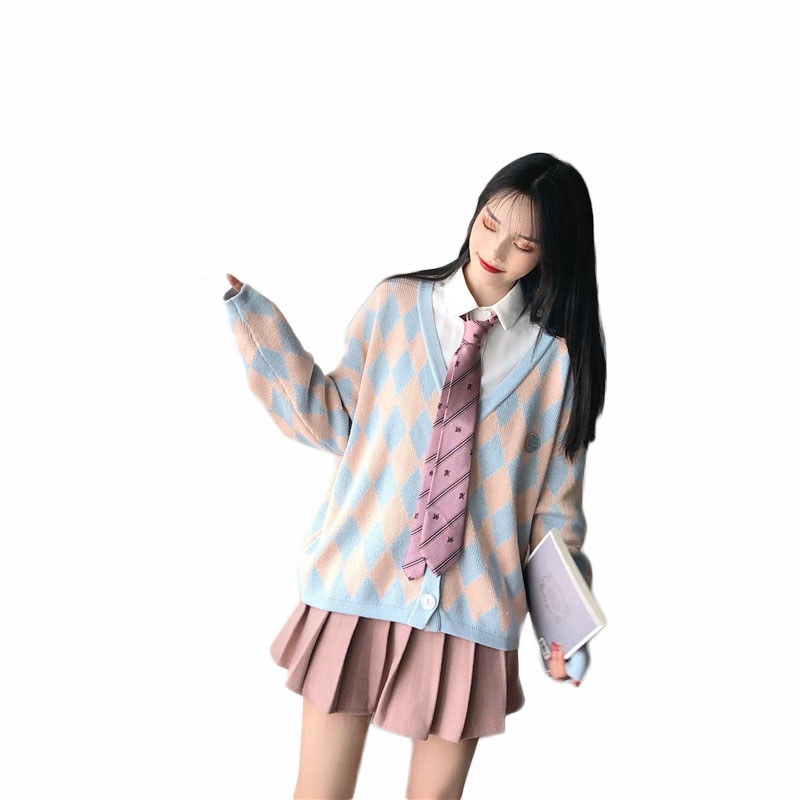 / 韓國復古風寬松顯瘦菱格毛衣開衫+粉色毛呢半身裙+襯衣時尚三件套