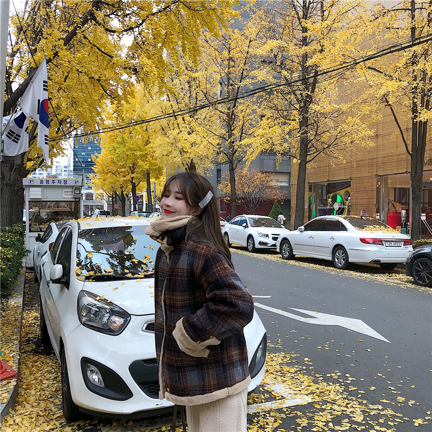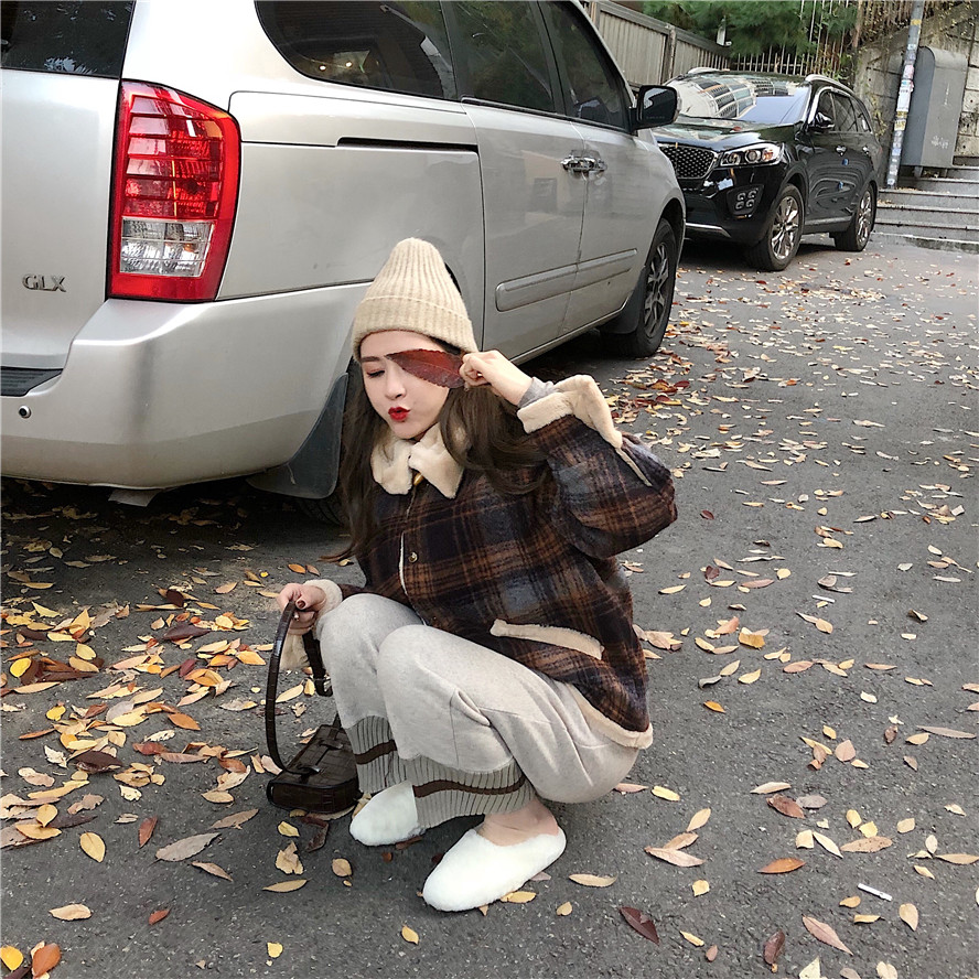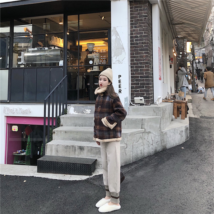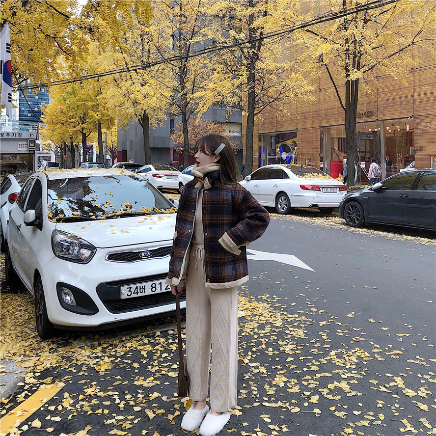/ 2018秋冬新款百搭高領打底+復古加絨毛呢格子+系帶麻花針織褲套裝