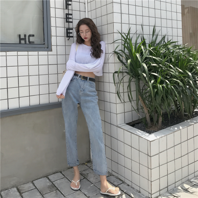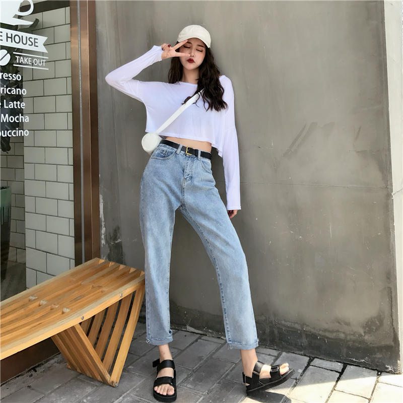韓版時尚秋裝女2018新款個性腰封系帶寬松顯瘦直筒牛仔褲顯瘦休閑