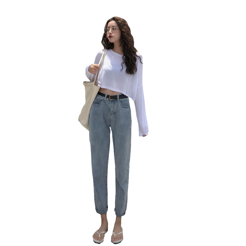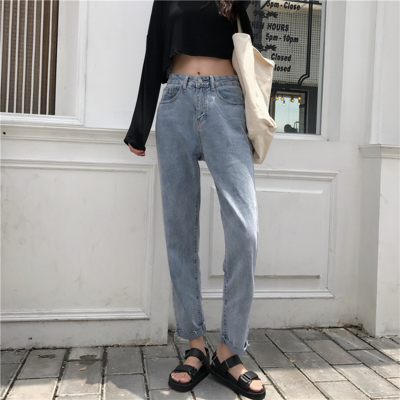 / 牛仔褲女夏時尚復古風休閑百搭淺色高腰直筒修身顯瘦小腳牛仔褲潮