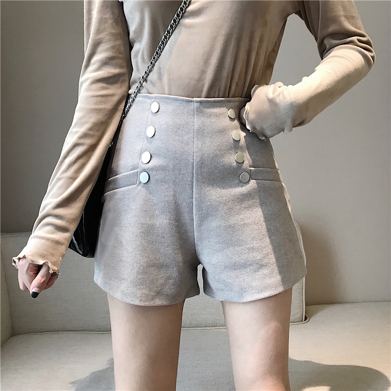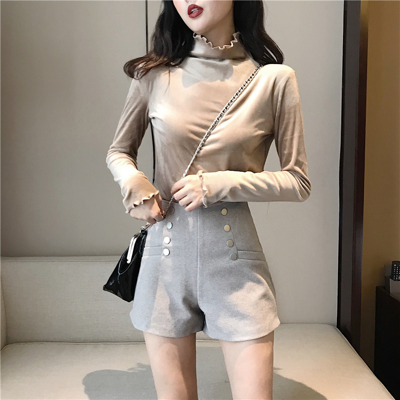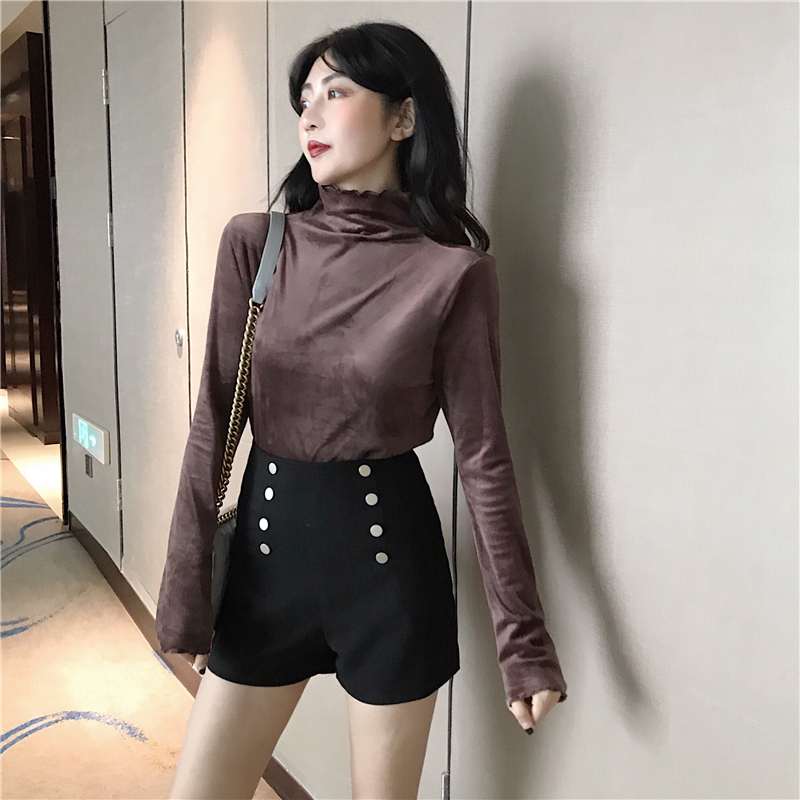 復古秋裝女2018新款雙排扣高腰短褲+簡約顯瘦高領絲絨打底衫套裝