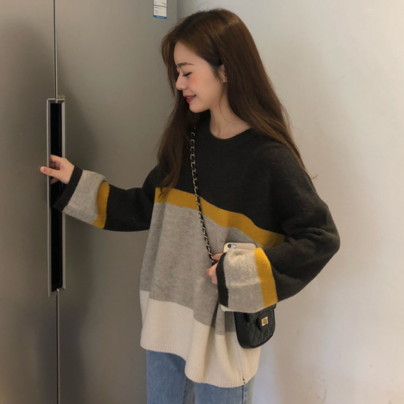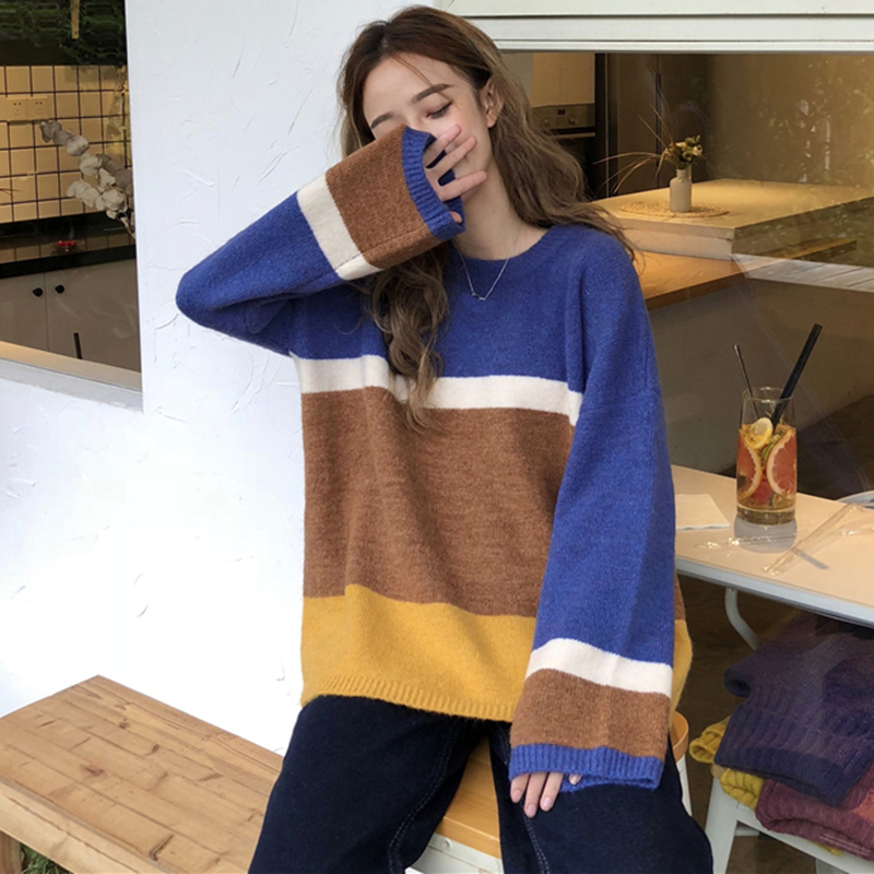 / 撞色條紋慵懶毛衣女秋冬裝2018新款圓領針織外套學生寬松長袖上衣
