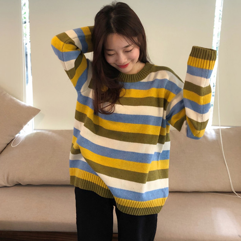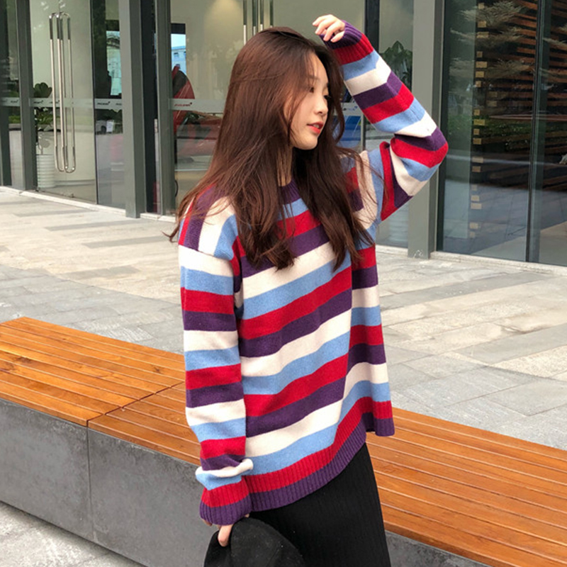 / 秋冬女裝2018新款韓版彩虹條紋撞色套頭針織衫慵懶風寬松毛衣外套