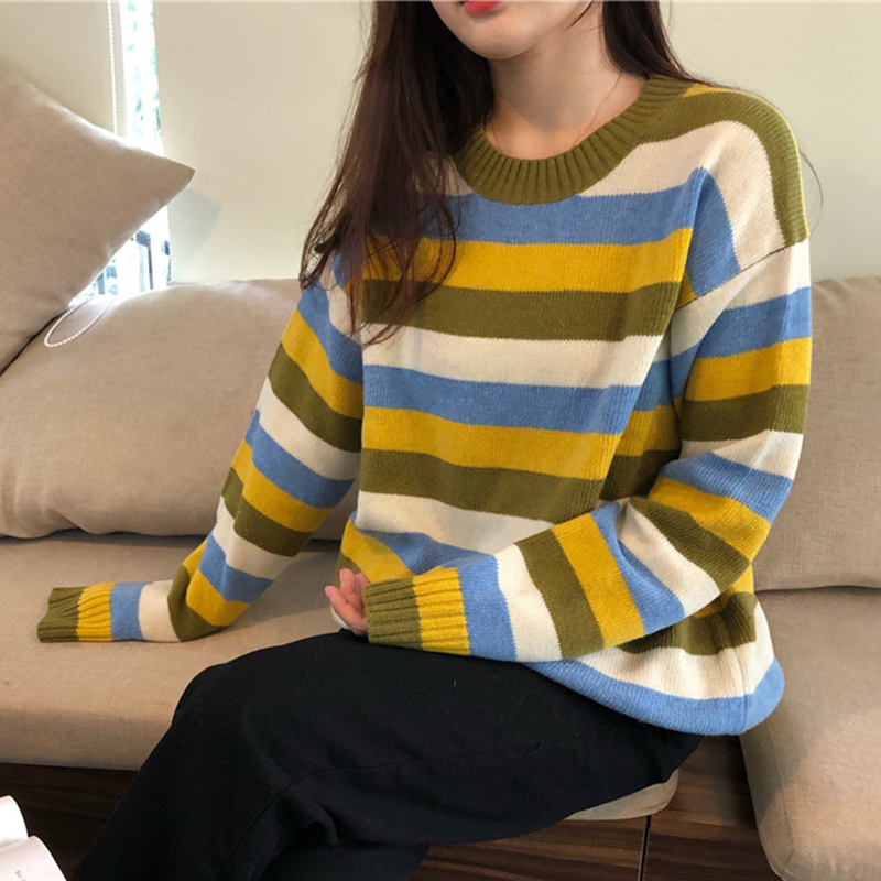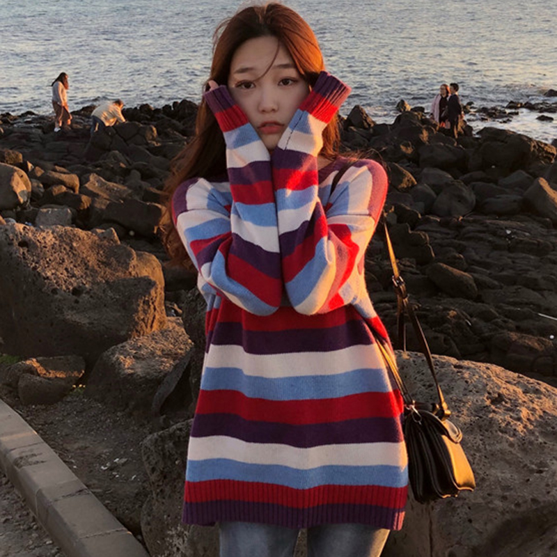 秋冬女裝2018新款韓版彩虹條紋撞色套頭針織衫慵懶風寬松毛衣外套