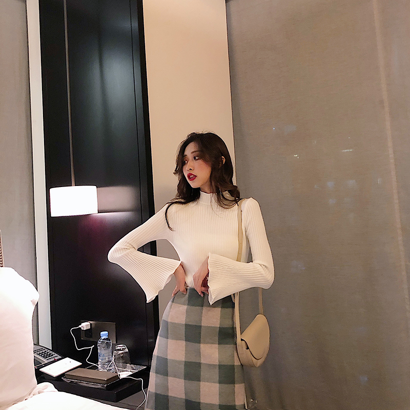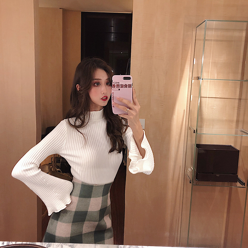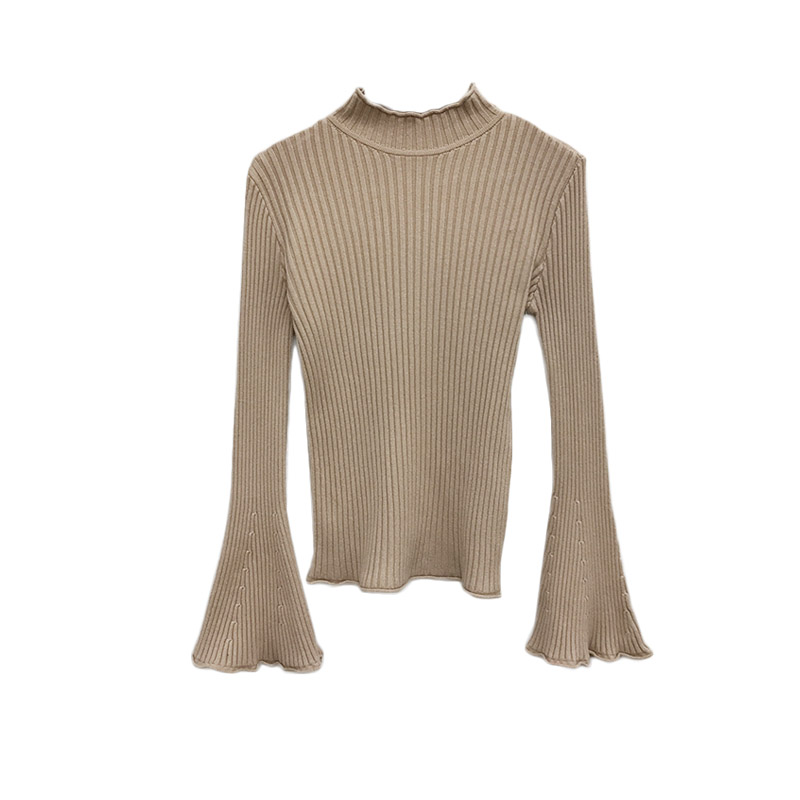 chic早秋毛衣慵懶風喇叭袖半高領加厚套頭長袖針織衫打底衫毛衣女