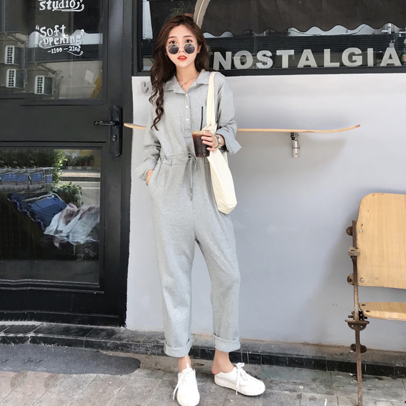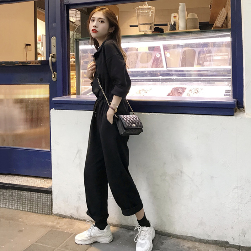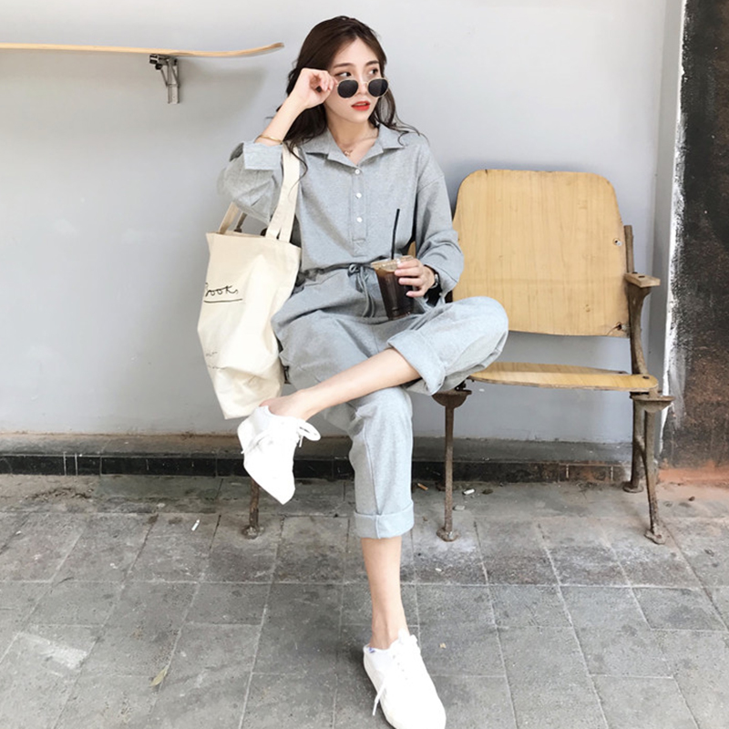 秋裝休閑褲直筒長褲2018新款韓版寬松抽繩收腰連體褲高腰闊腿褲女