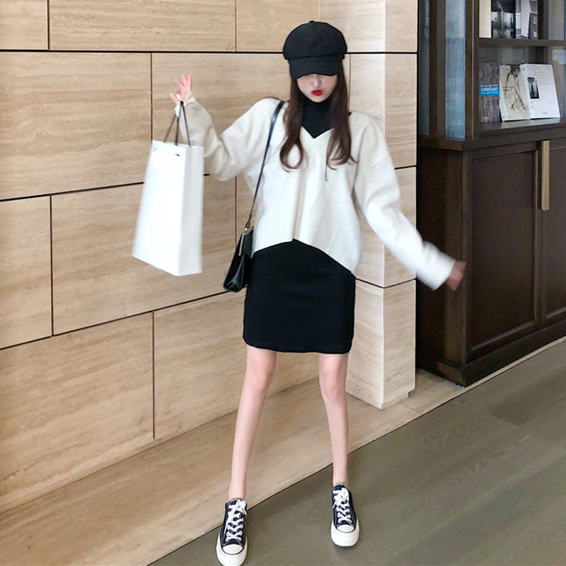 氣質女神兩件套秋冬新款毛呢寬松V領套頭上衣修身高領彈力連衣裙