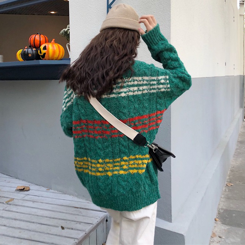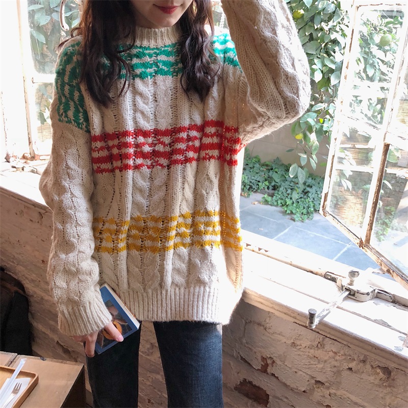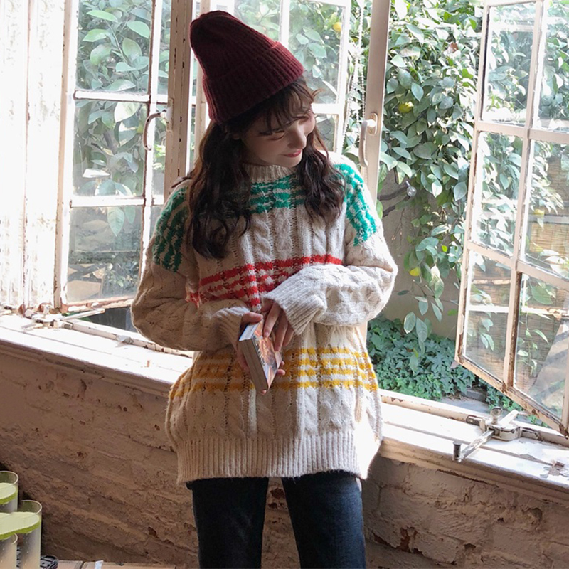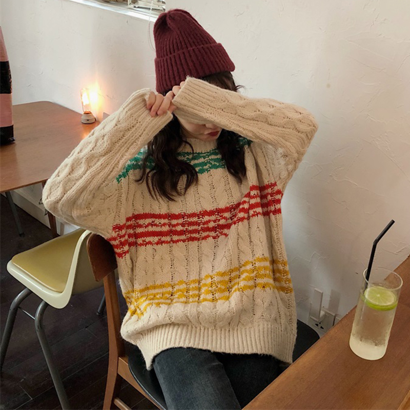 時尚拼色條紋毛衣女秋冬裝2018新款慵懶寬松針織外套休閑長袖上衣