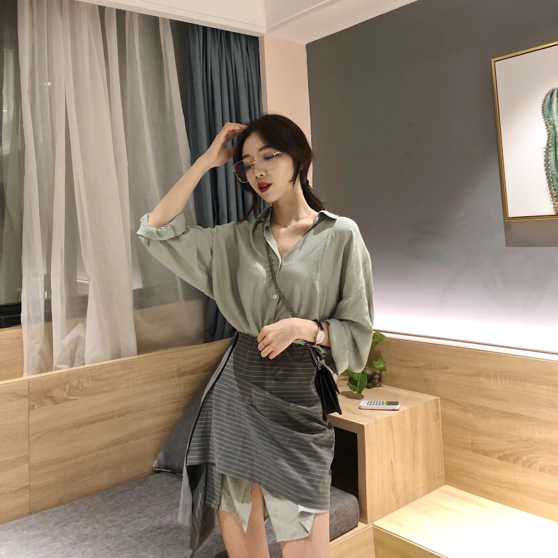 / 港味秋裝新款套裝中長款休閑長袖襯衫+高腰復古不規則半身裙A字裙