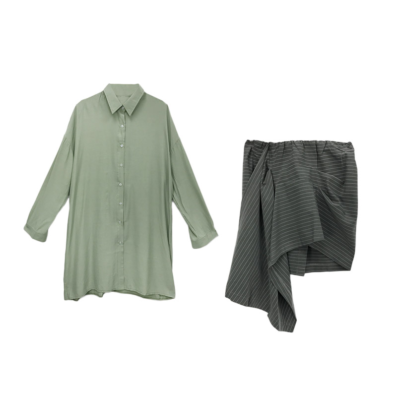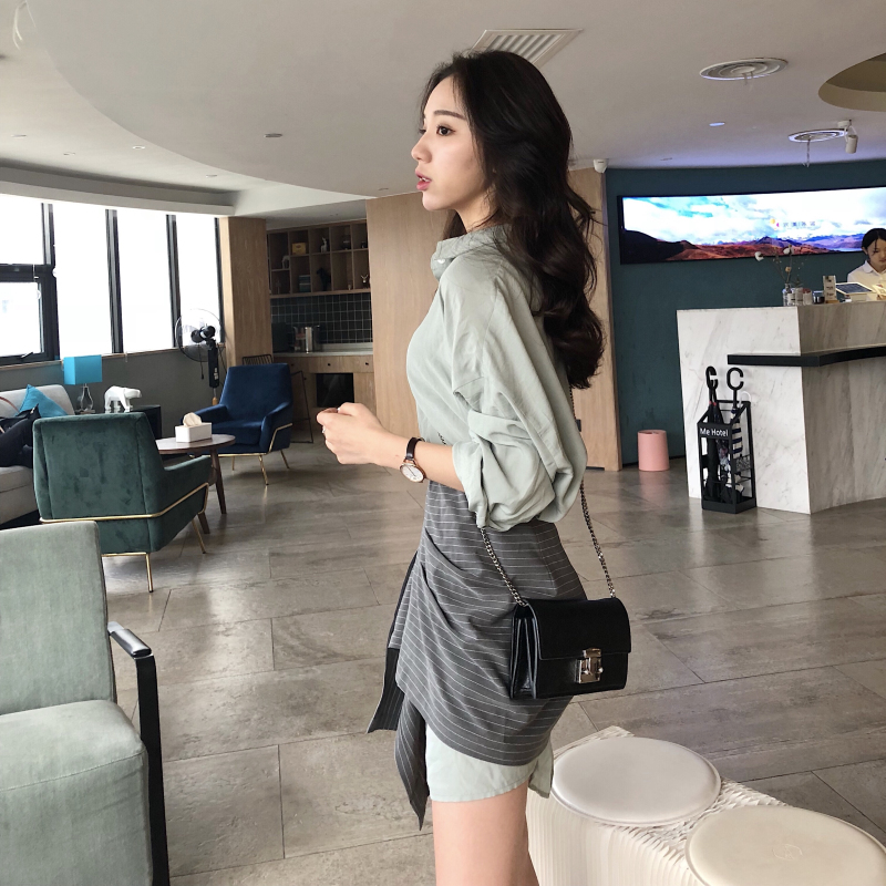 復古條紋長袖襯衫+高腰抹胸式半身短裙兩件套裝女夏新款分開拍潮