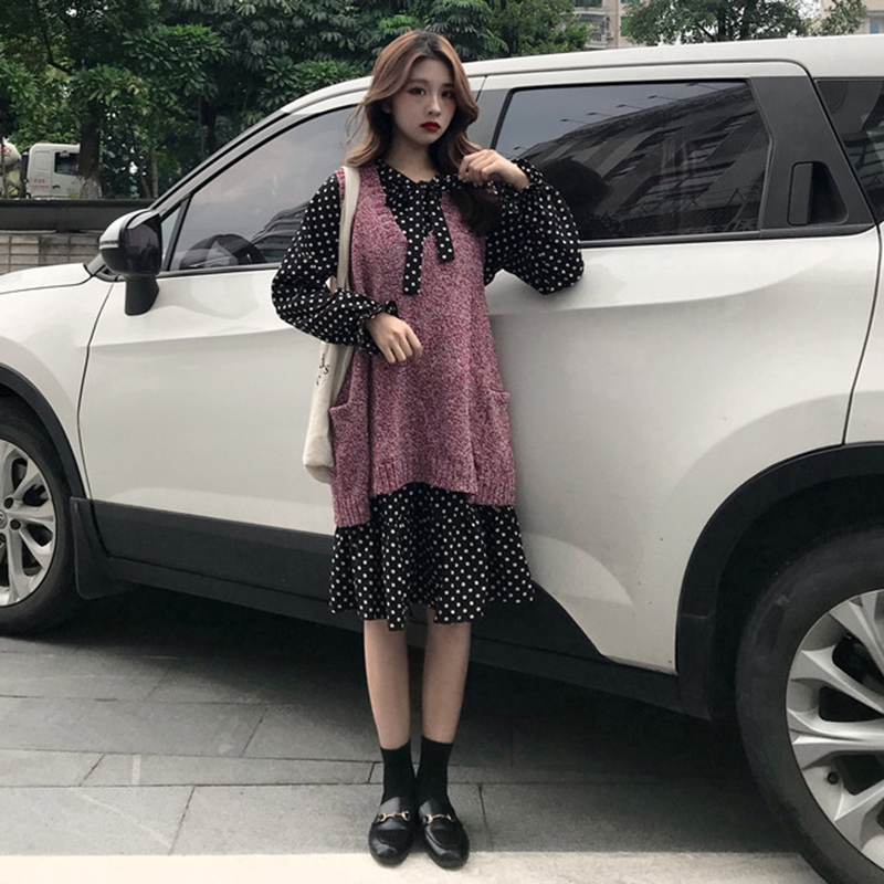 秋裝女2018新款寬松長袖波點荷葉連衣裙復古外搭無袖背心毛衣套裝