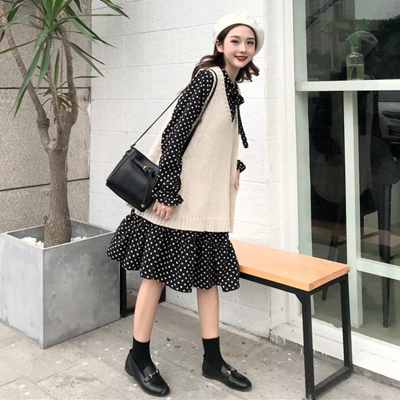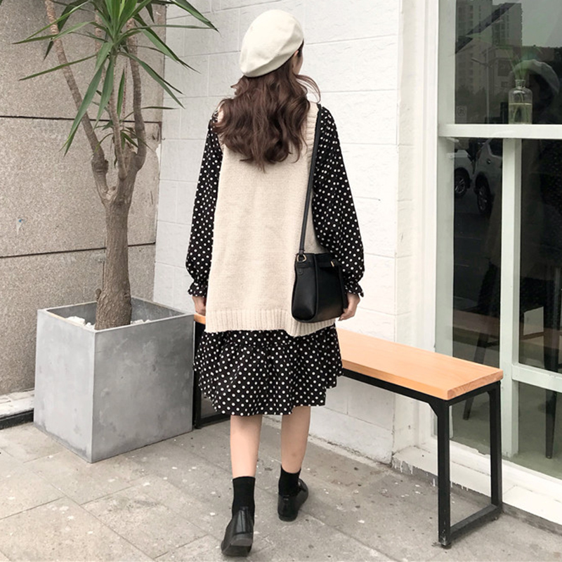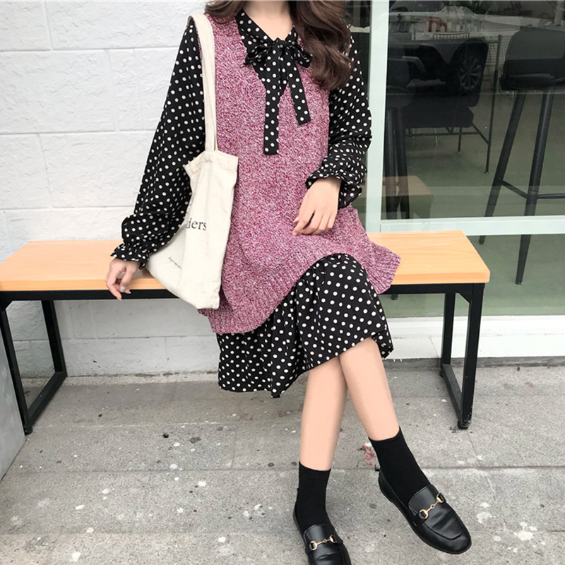 / 秋裝女2018新款寬松長袖波點荷葉連衣裙復古外搭無袖背心毛衣套裝
